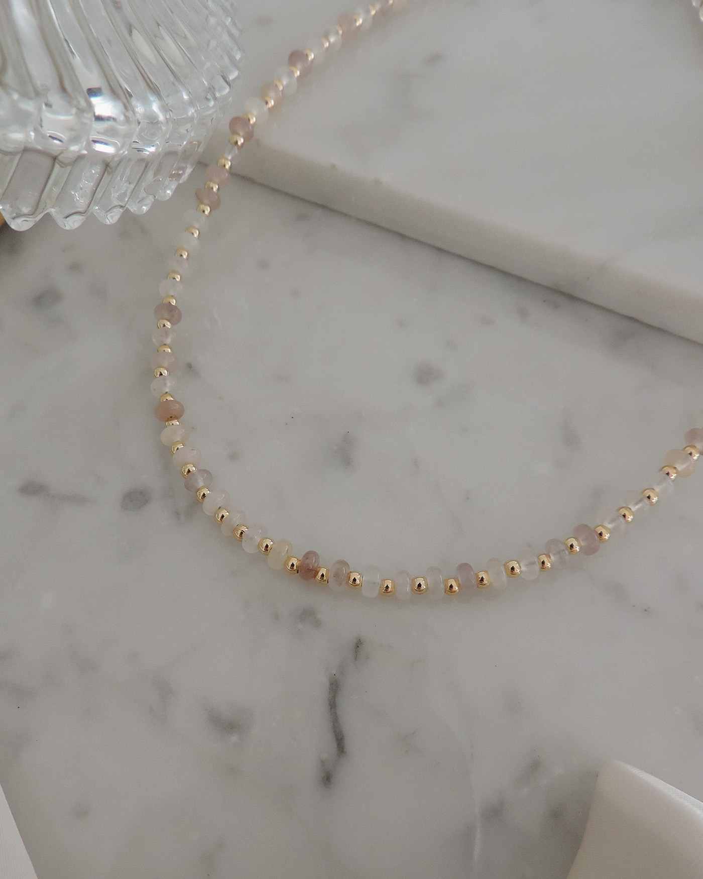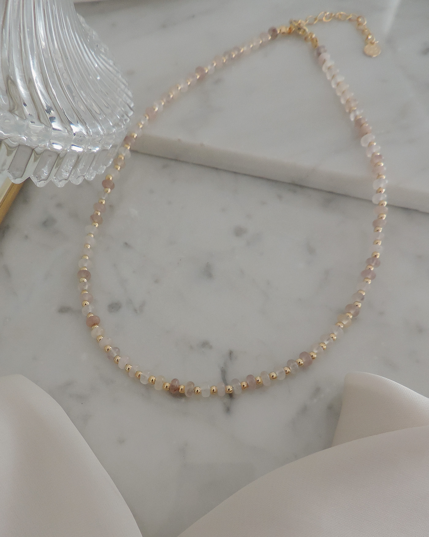 Collar tipo gargantilla, es flexible, realizado con piedras naturales lepidolita dona lisa de 4mmø y cuentas + terminaciones de oro laminado hipoalergénico.
