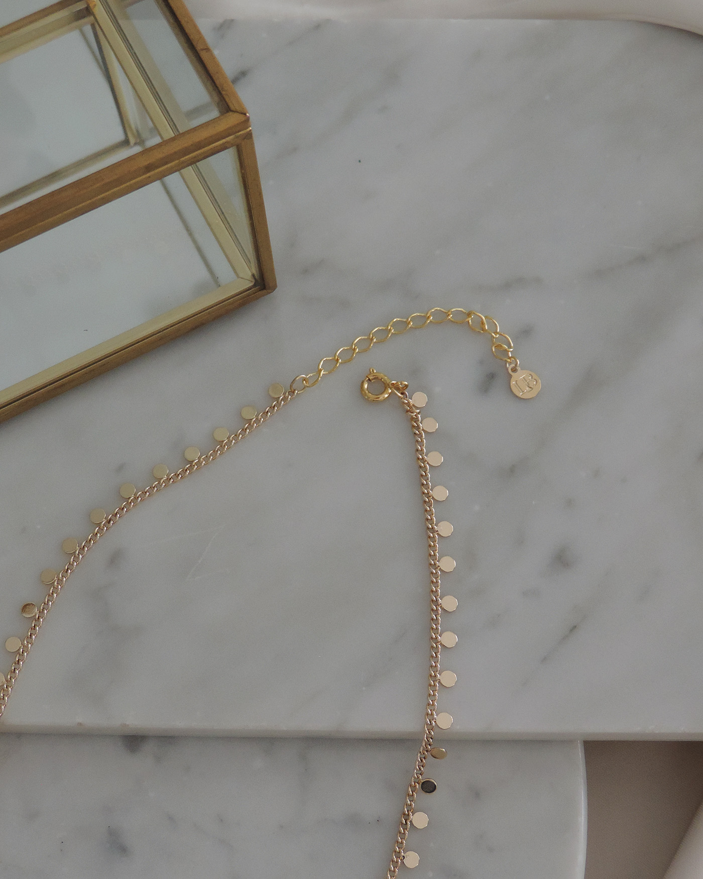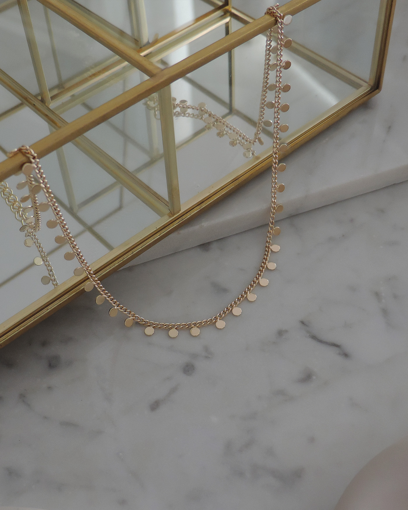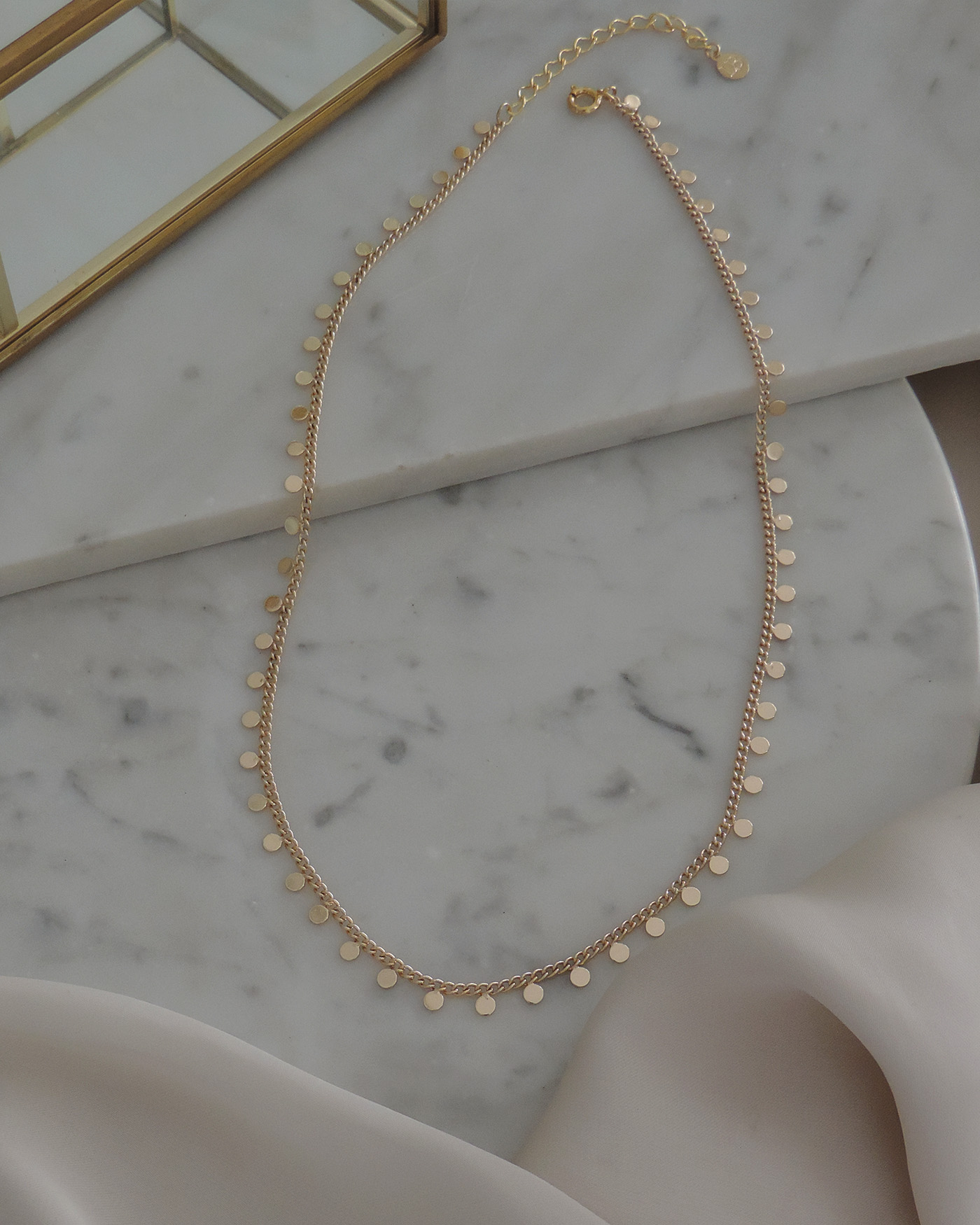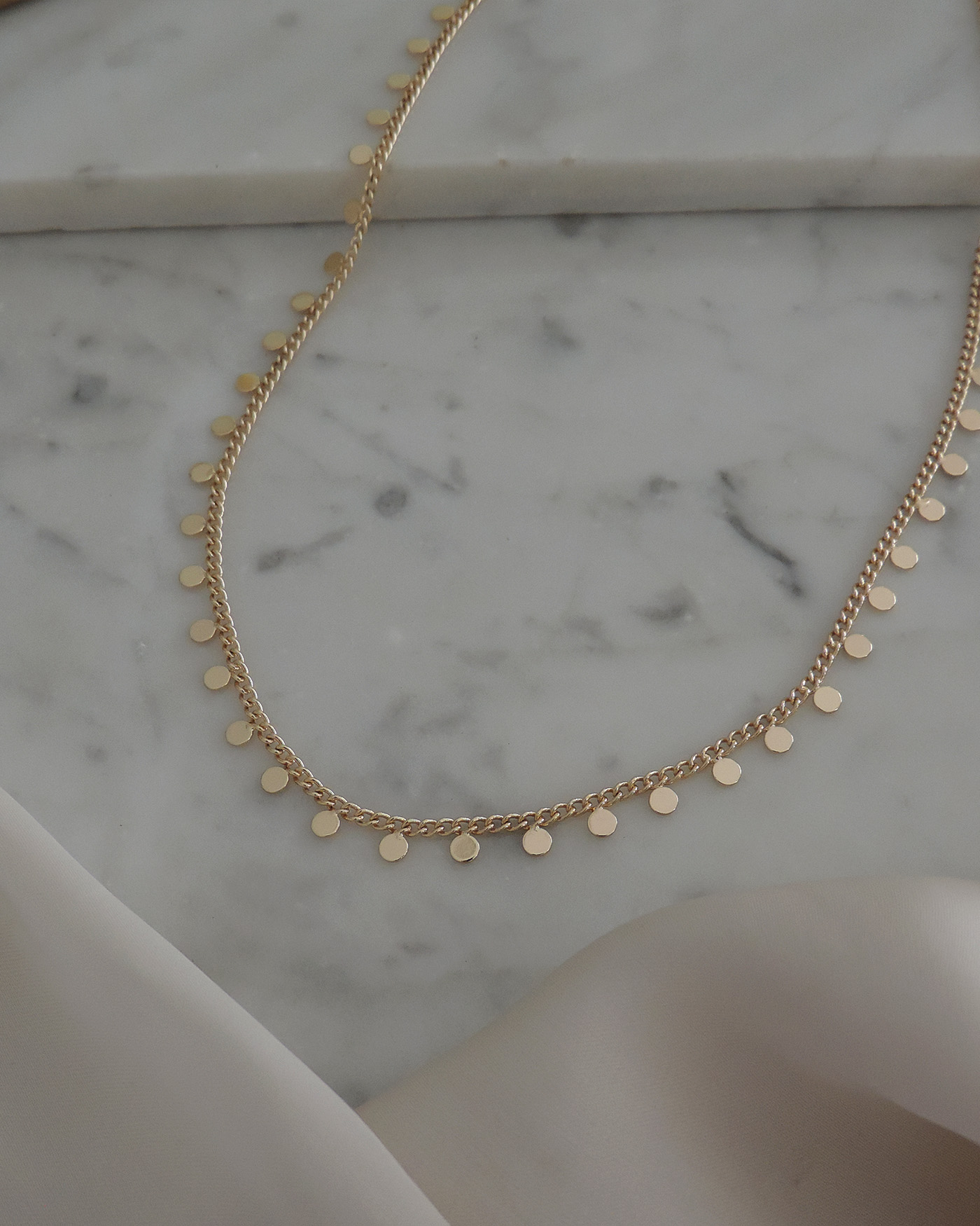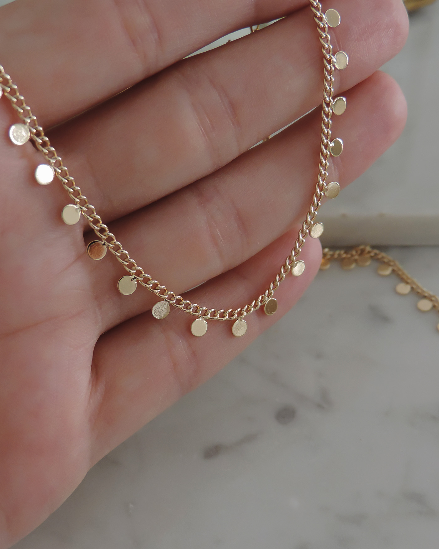 Collar gargantilla realizado con cadena básica con moneditas mini soldadas. Todo en laminado en oro hipoalergénico.