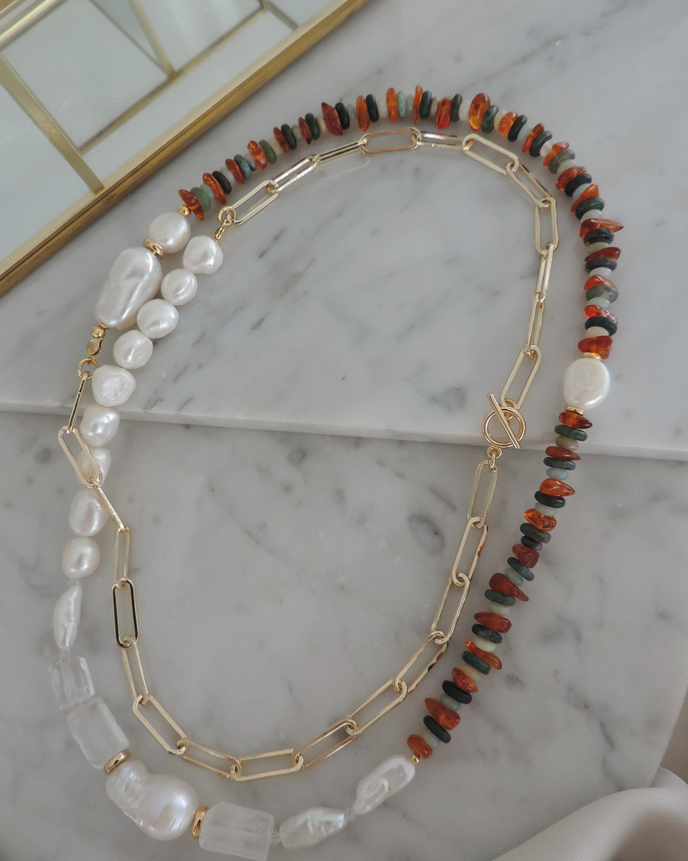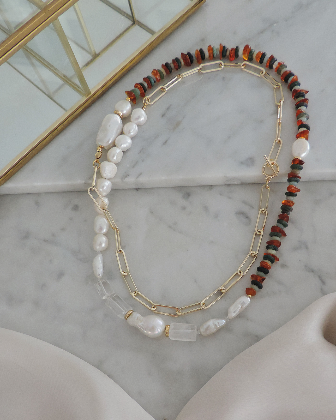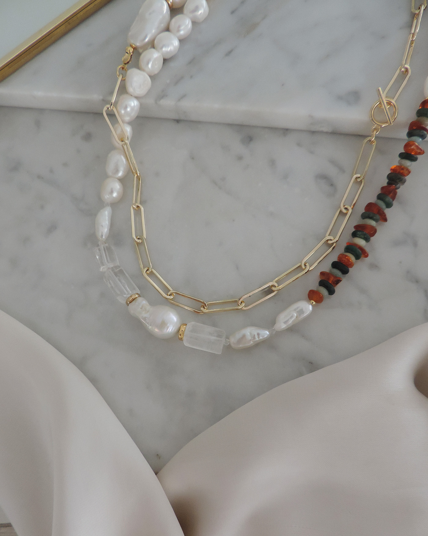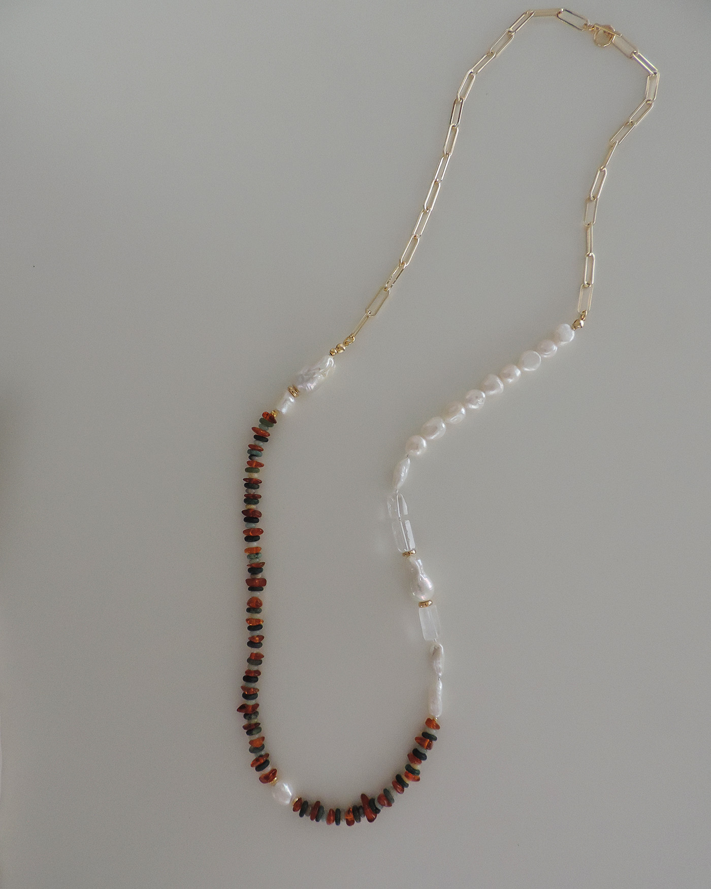 Collar largo (para usar doble vuelta). Diseñado en una parte con: perlas naturales varias (diferentes formas y tamaño) + cuentas de cuarzo cristal cilindro. y la otra parte con: piedras varias (ámbar escalla, dona ágata musgo y dona amazonita). Tramo cadena rectangular de eslabón 14mm + broche palanca marinero. Terminaciones en oro laminado hipoalergénico.