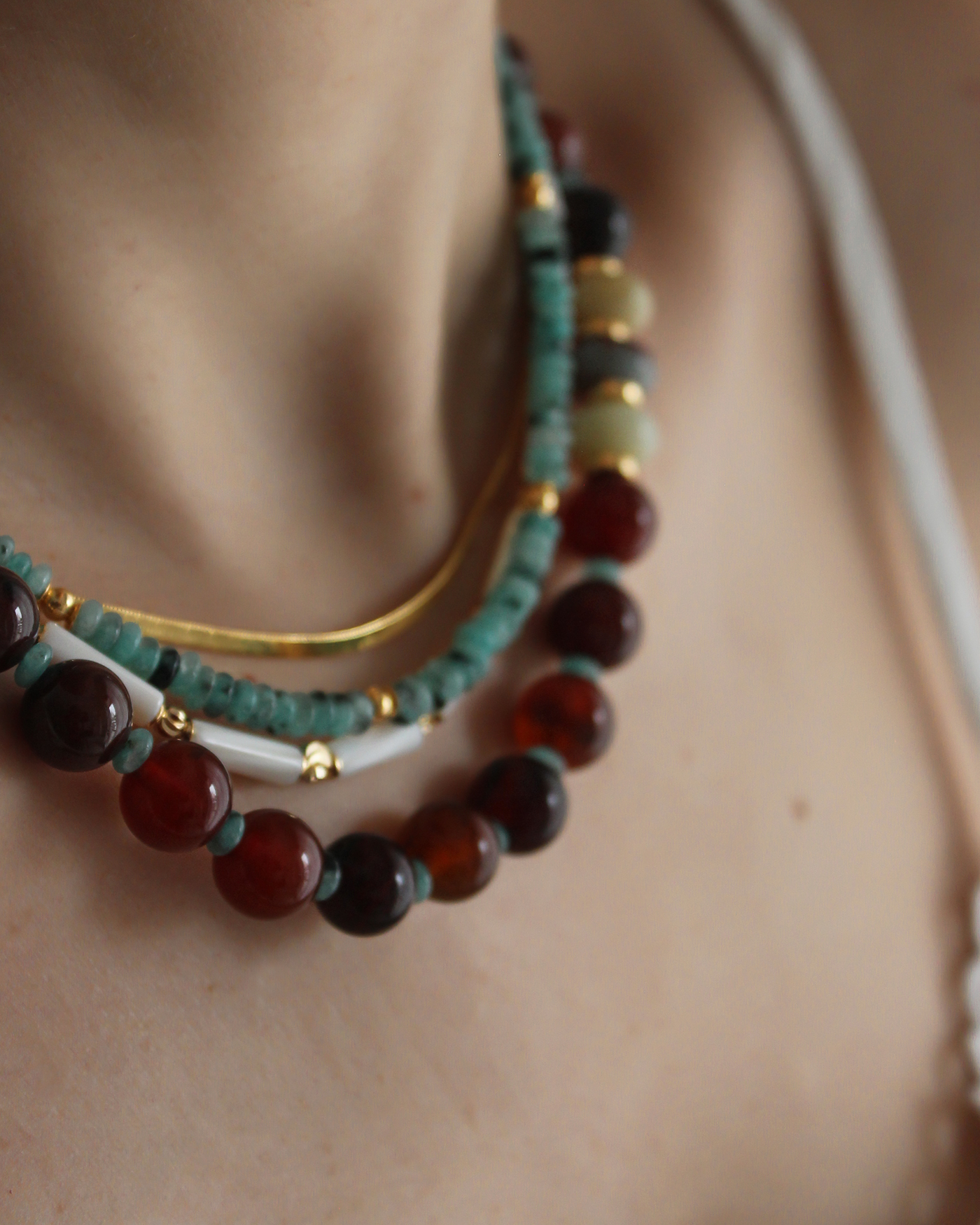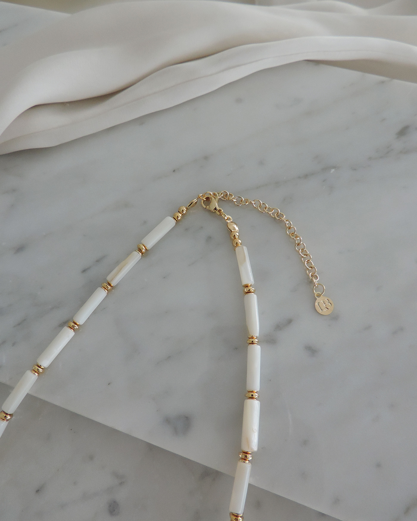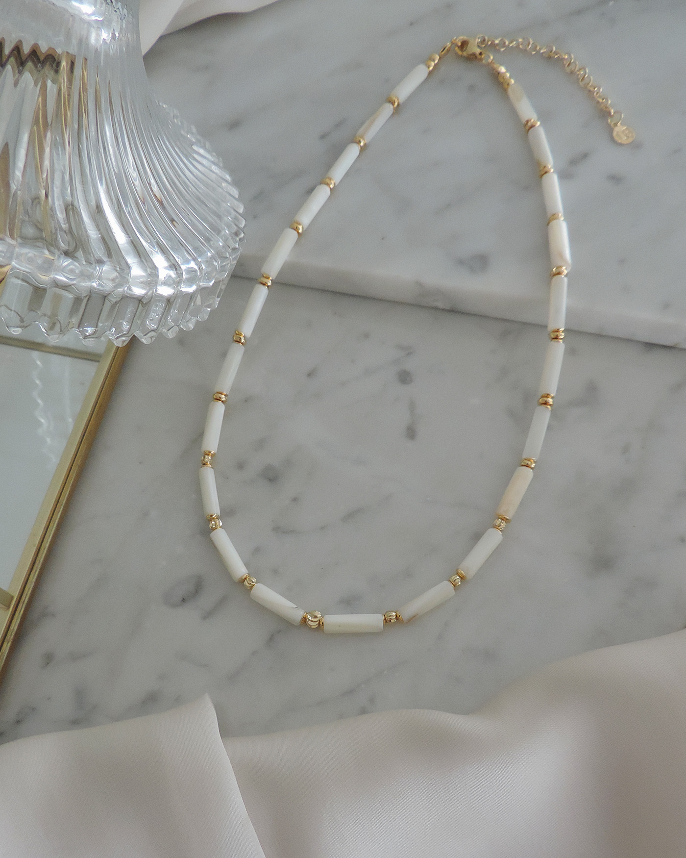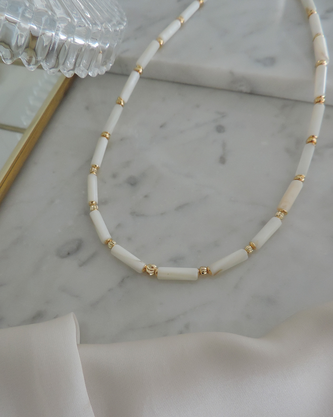 Collar flexible, realizado con piedras naturales nacar en forma de tubo de 13mm aprox. intercaladas con balines + cuentas y terminaciones de oro laminado hipoalergénico.