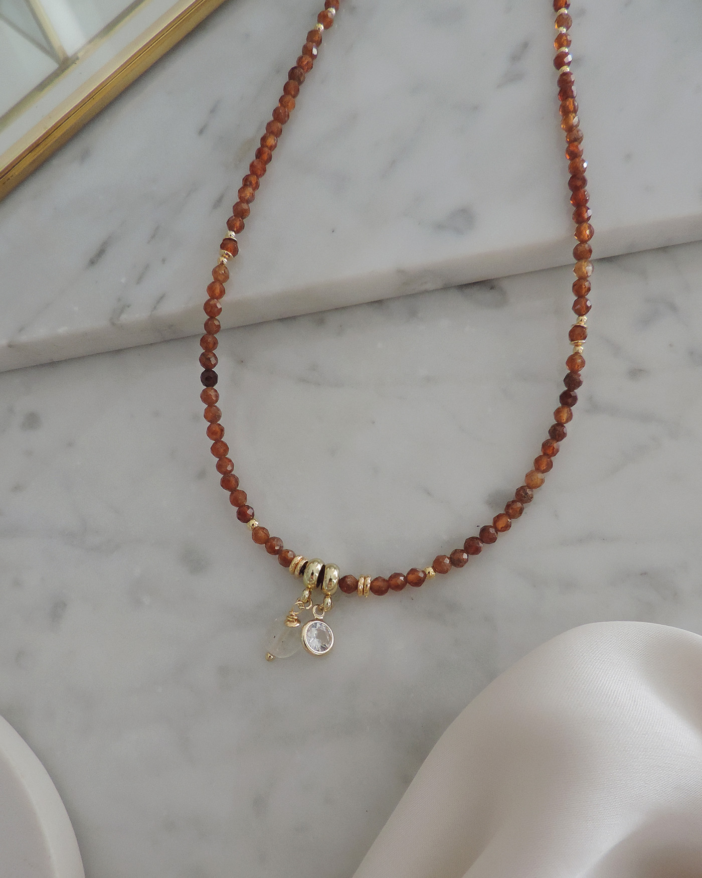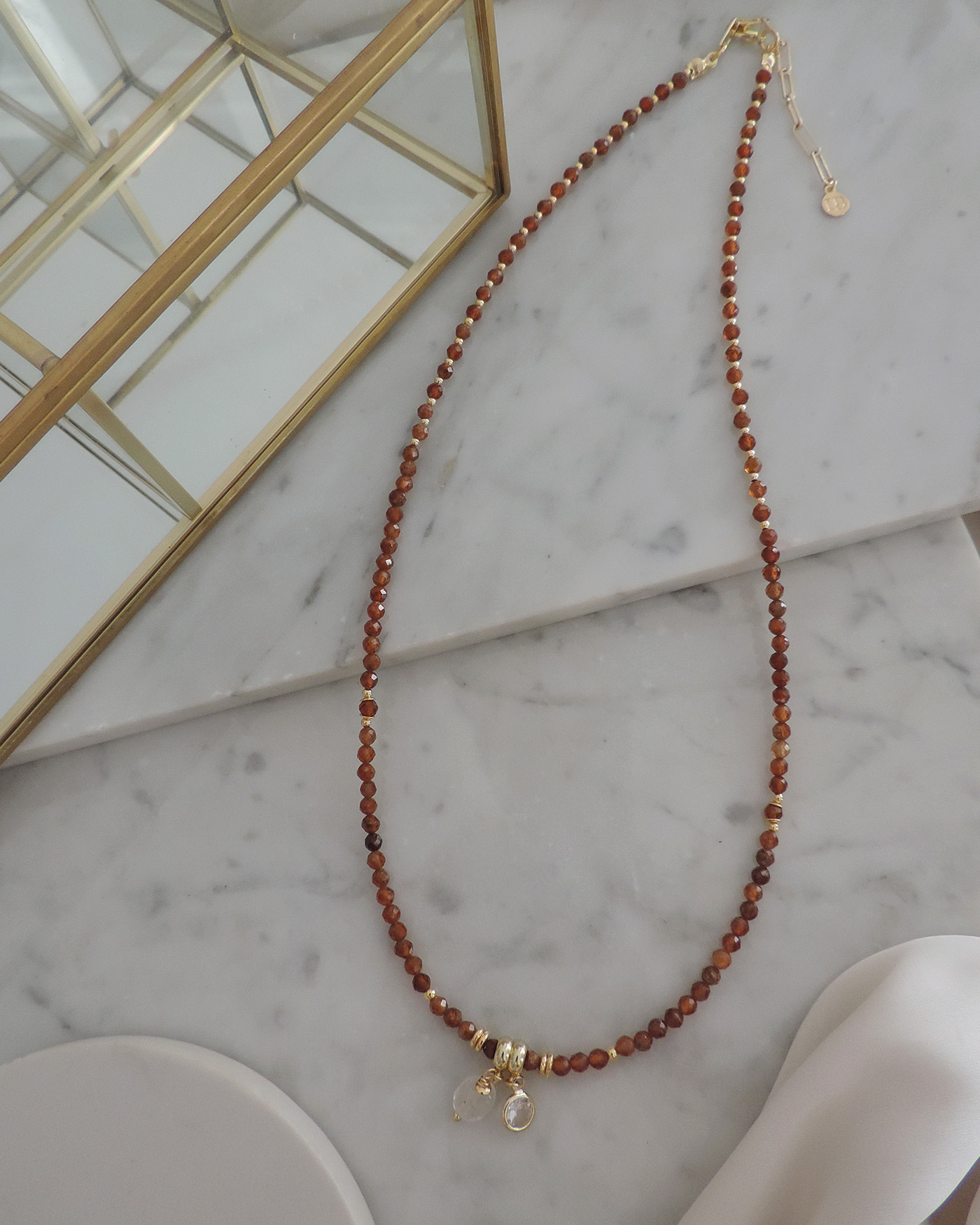 Collar largo con tanza metálica flexible, realizado con piedras granate naranja/marrón naturales facetadas de 3mm aprox.+ dijes cristal y piedrita cuarzo cristal. Cuentas y terminaciones de oro laminado hipoalergénico.