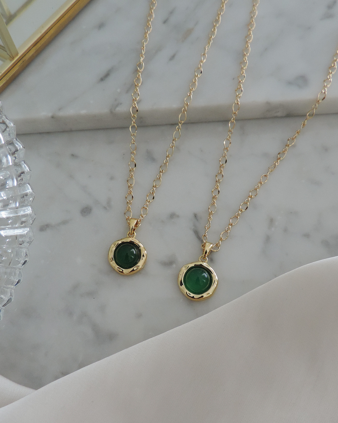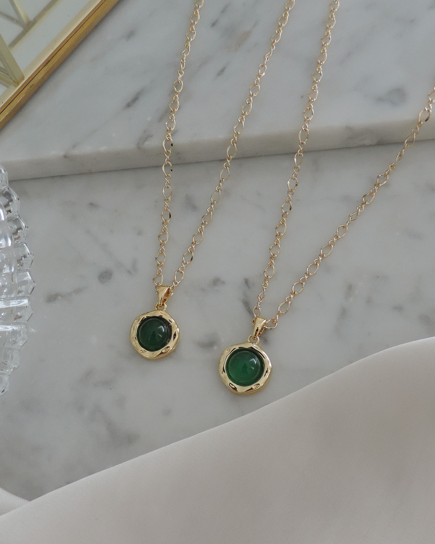 Collar realizado con cadena trenzas + dije piedra ónix verde con estructura enchapada en oro maciza de 15mm. Todo en laminado en oro hipoalergénico.