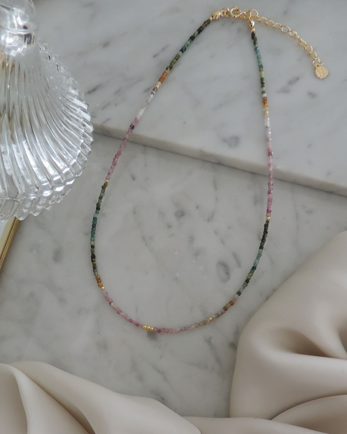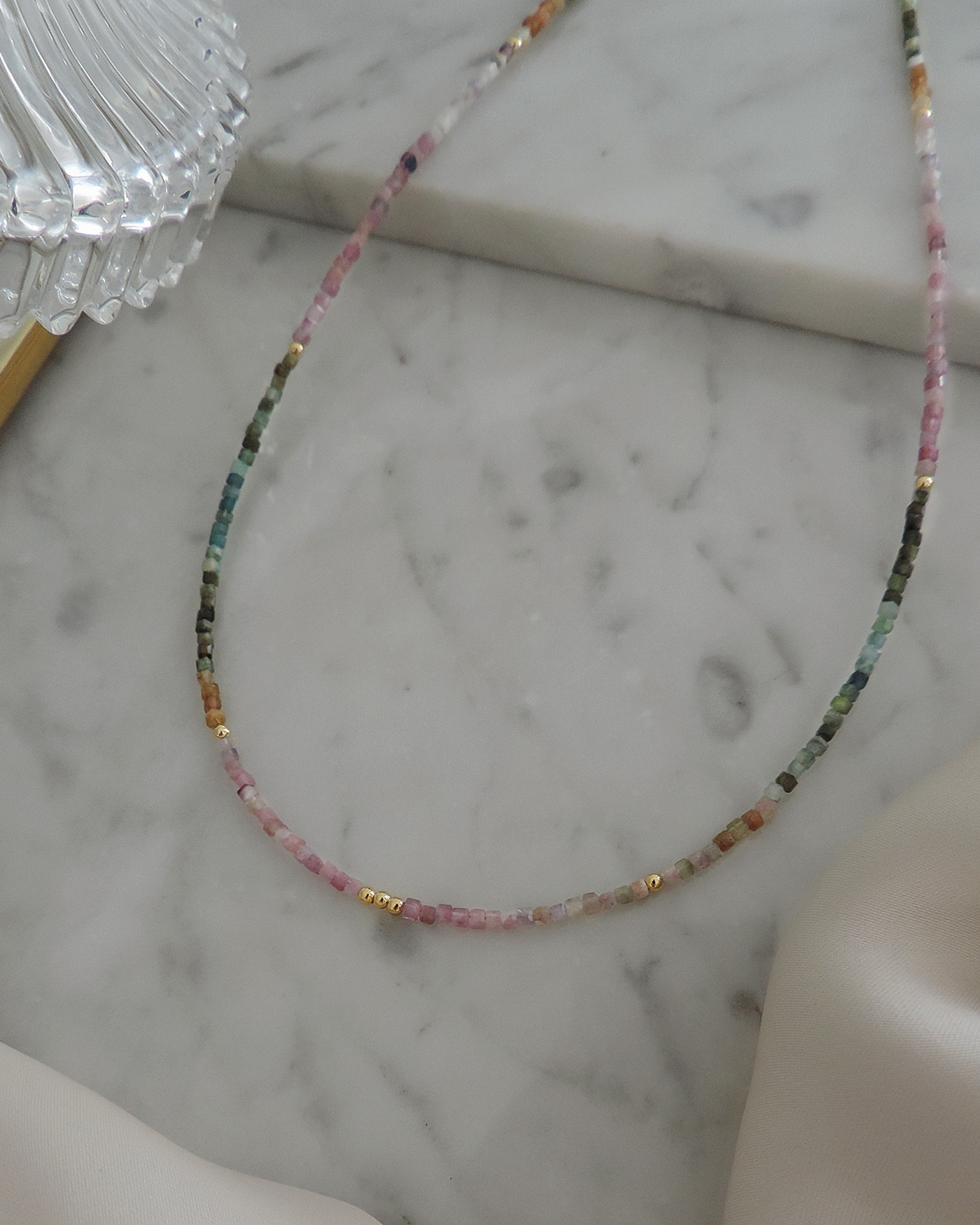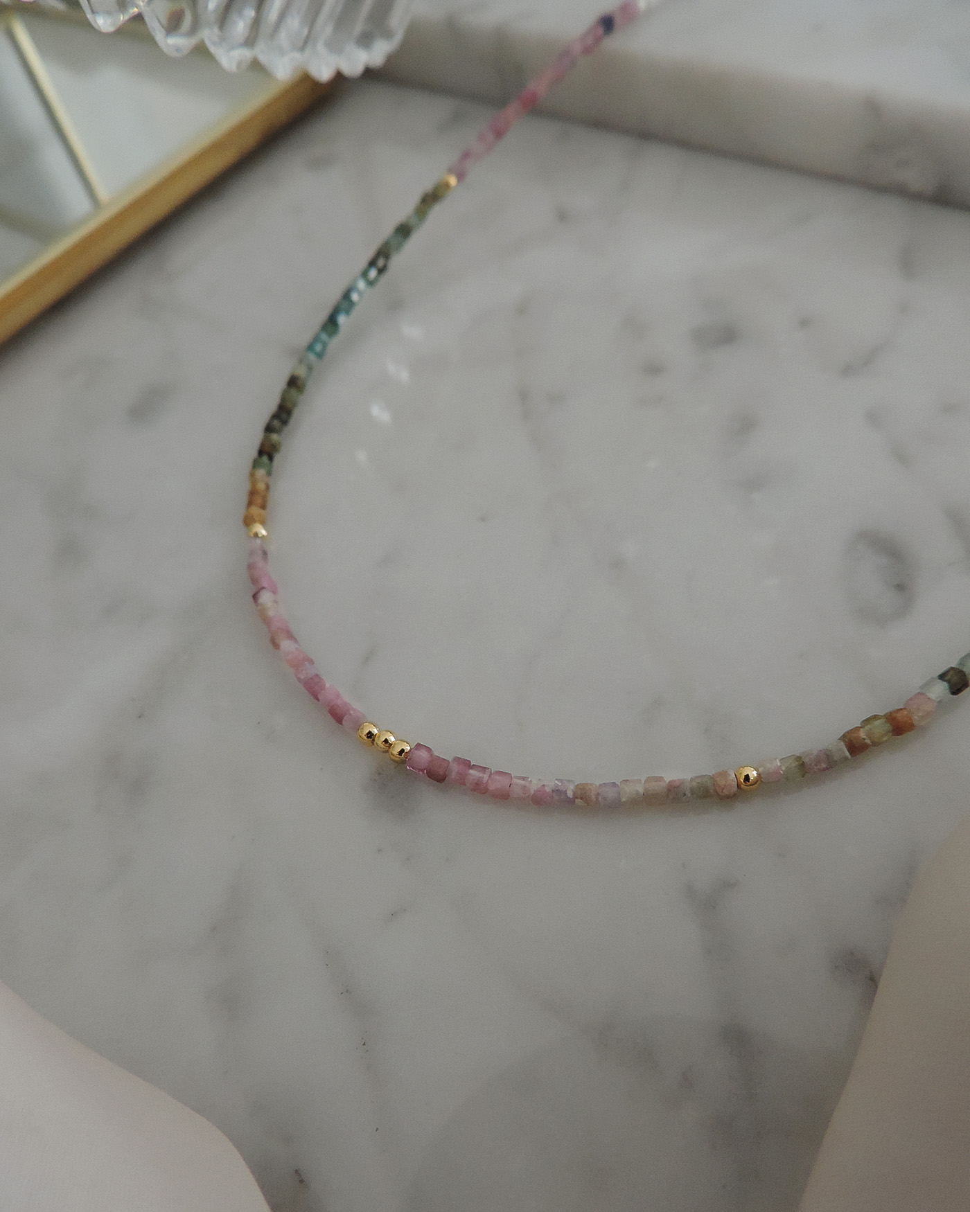 Collar flexible tipo gargantilla, realizado con piedras naturales turmalina sandia en forma cubo mini de 2mmø intercaladas con balines + cuentas y terminaciones de oro laminado hipoalergénico.