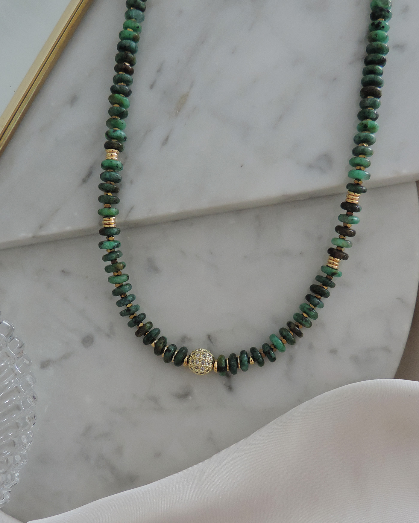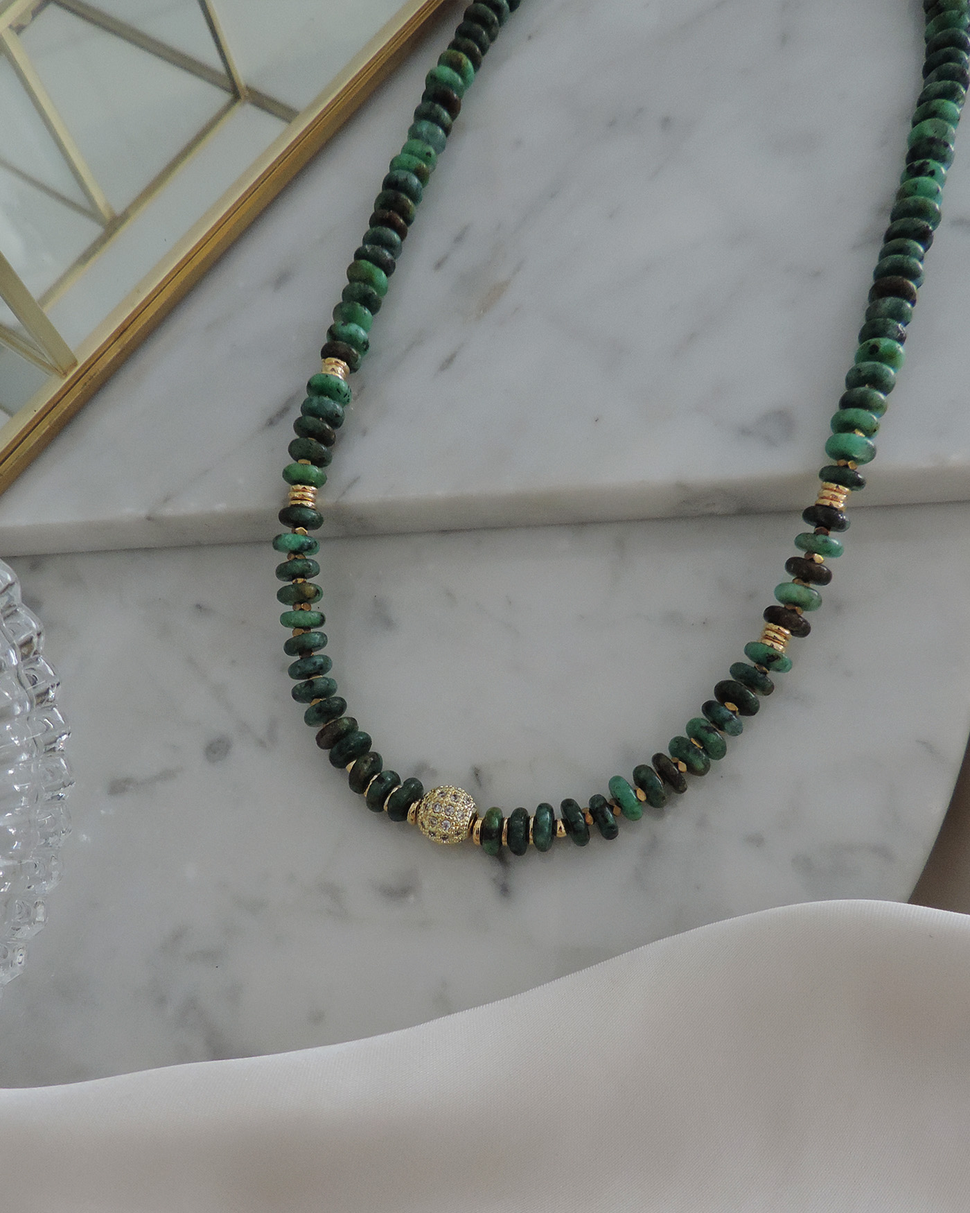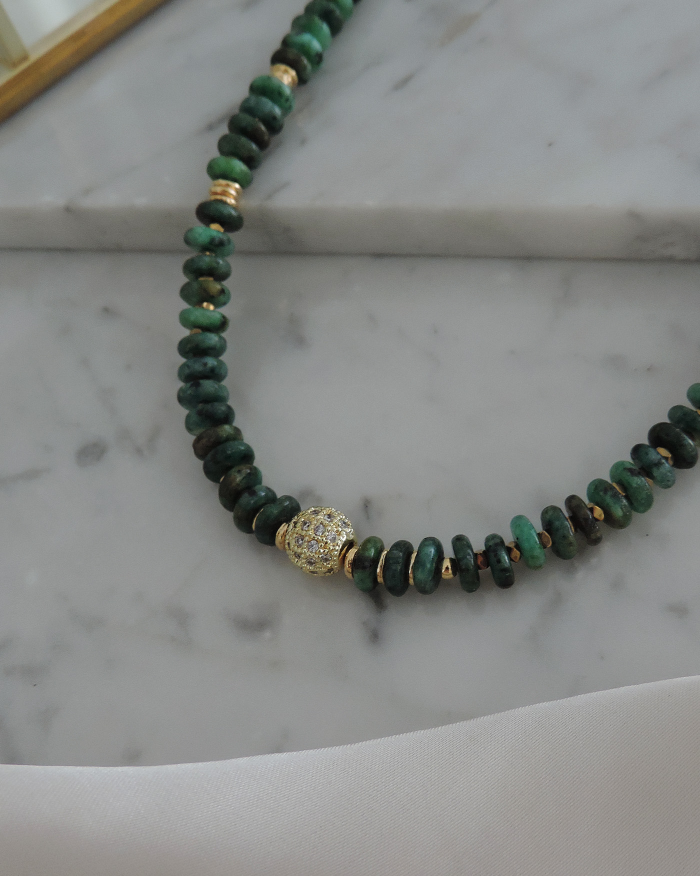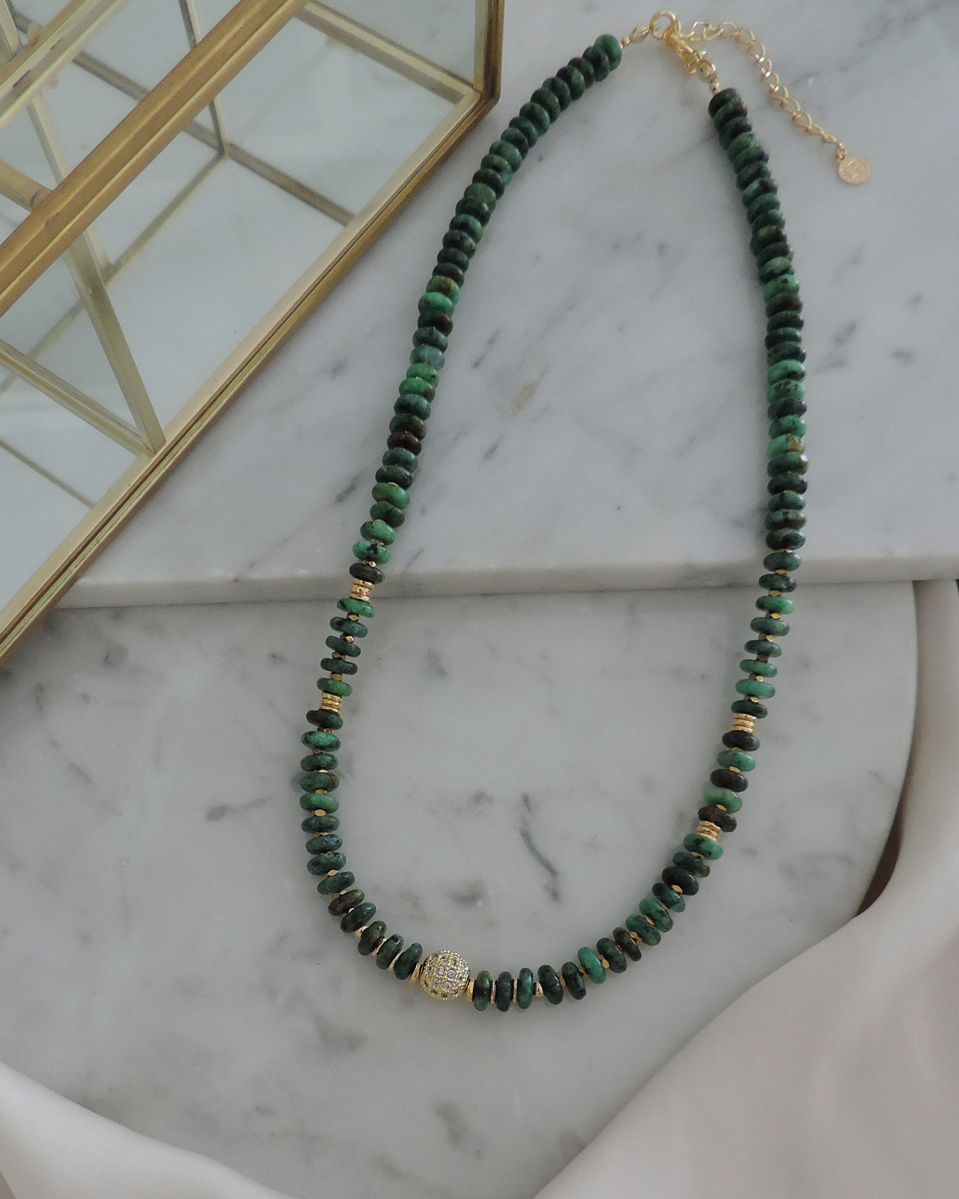 Collar en piedras naturales turquesa africana en forma de dona de 6x2mm aprox. centro bola de 8mm llena de circones e intercaladas con hematite mini. Cuentas y terminaciones en oro laminado hipoalergénico.