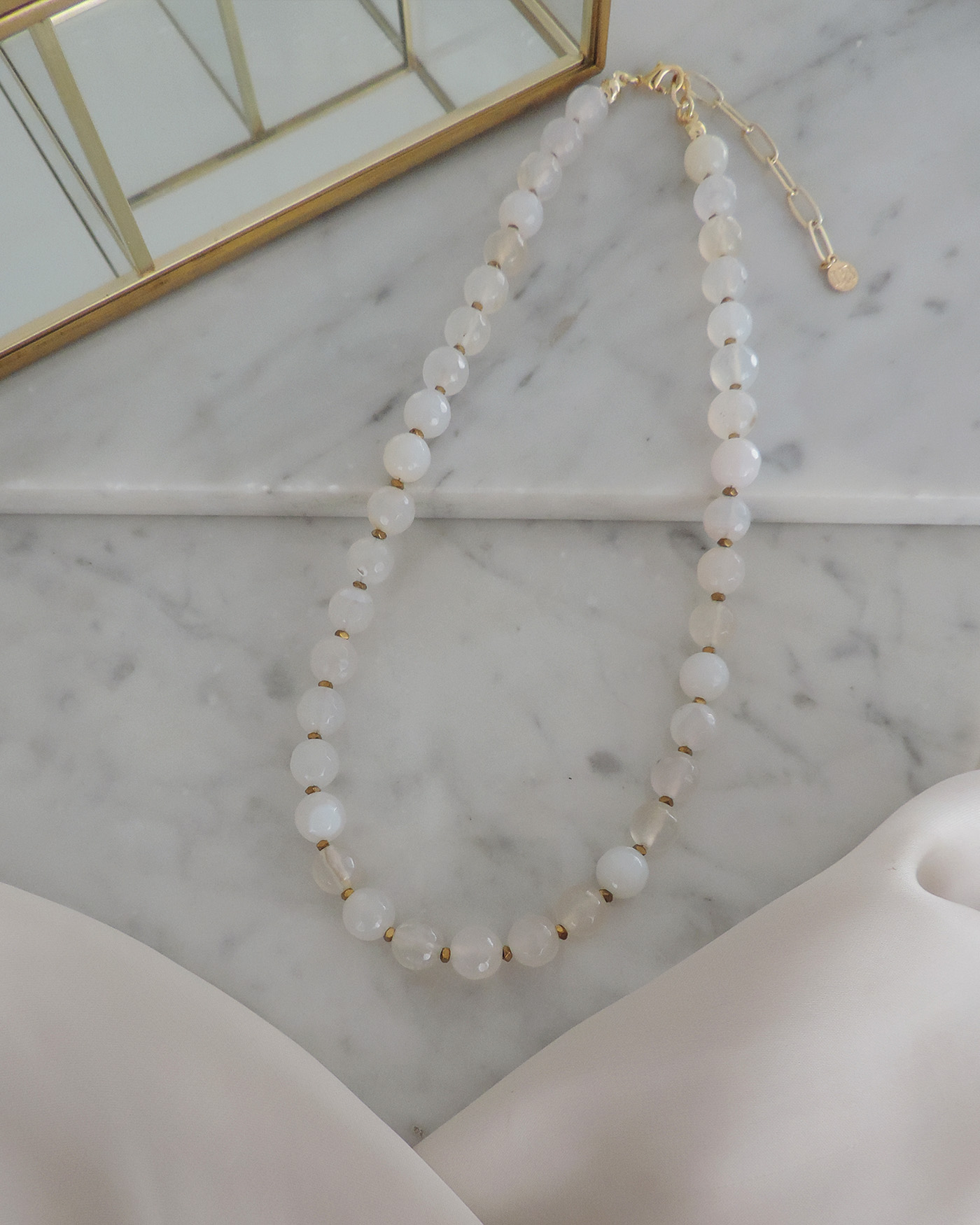 Collar con tanza metálica flexible, realizado con piedras cuarzo cremoso naturales de 8mm aprox.+ hematites. Terminaciones de oro laminado hipoalergénico.