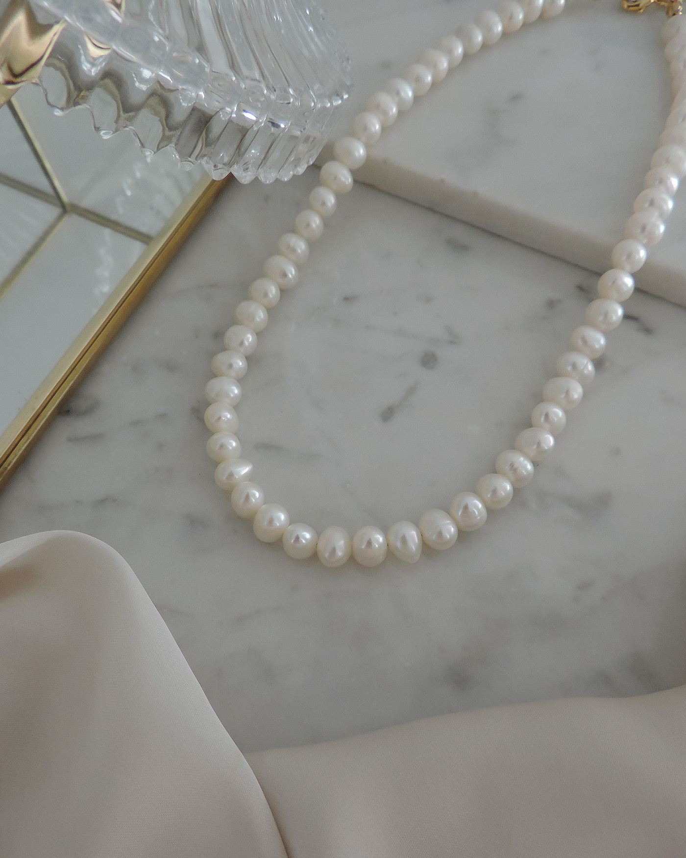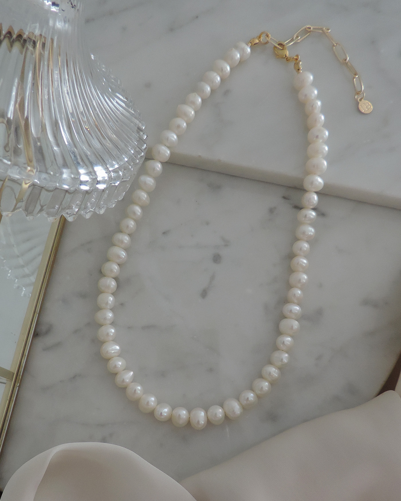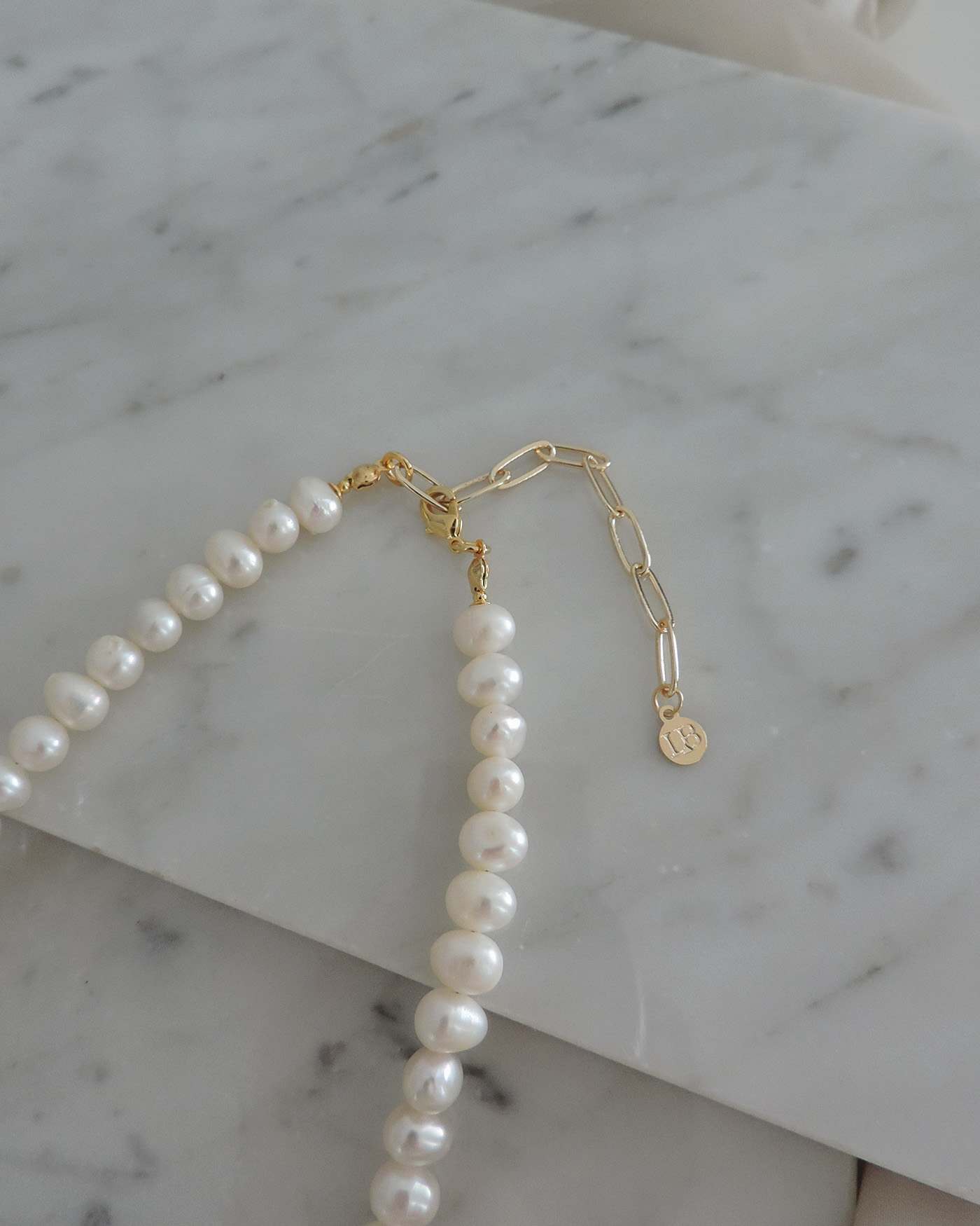 Collar tipo gargantilla en perlas de río naturales irregulares prémium de 6/7mm aprox. realizado con tanza flexible perforacion transversal. Terminaciones en oro laminado hipoalergénico. (Las perlas pueden variar su brillo, forma ya que son perlas naturales).