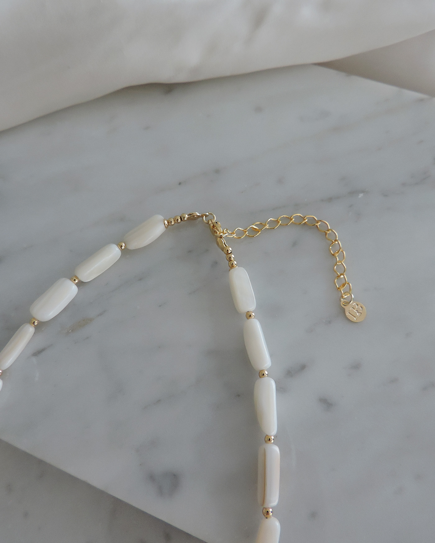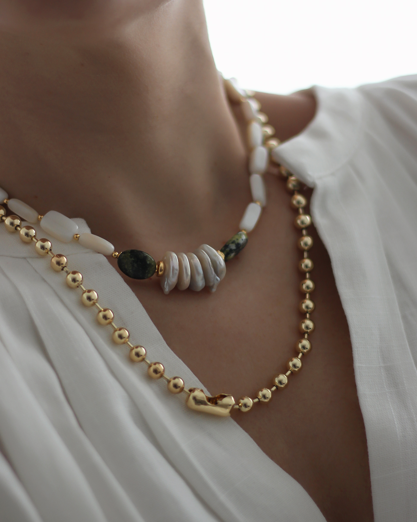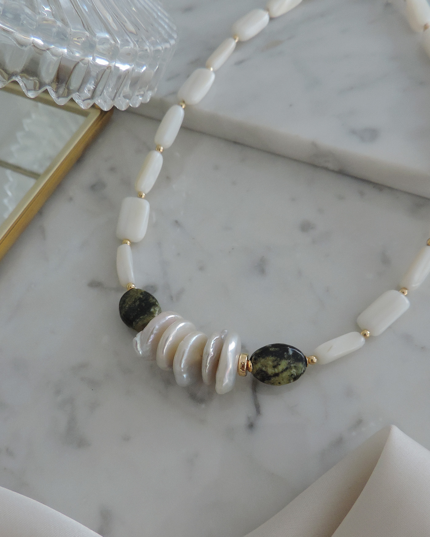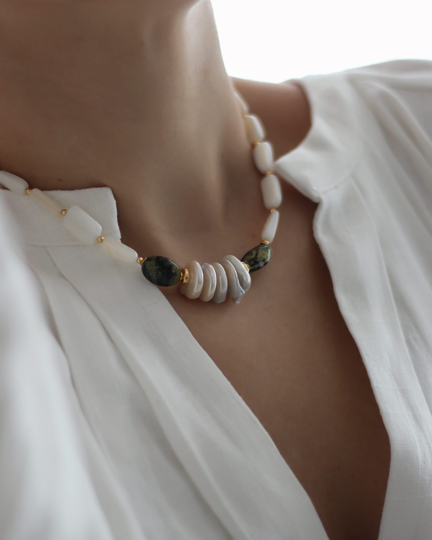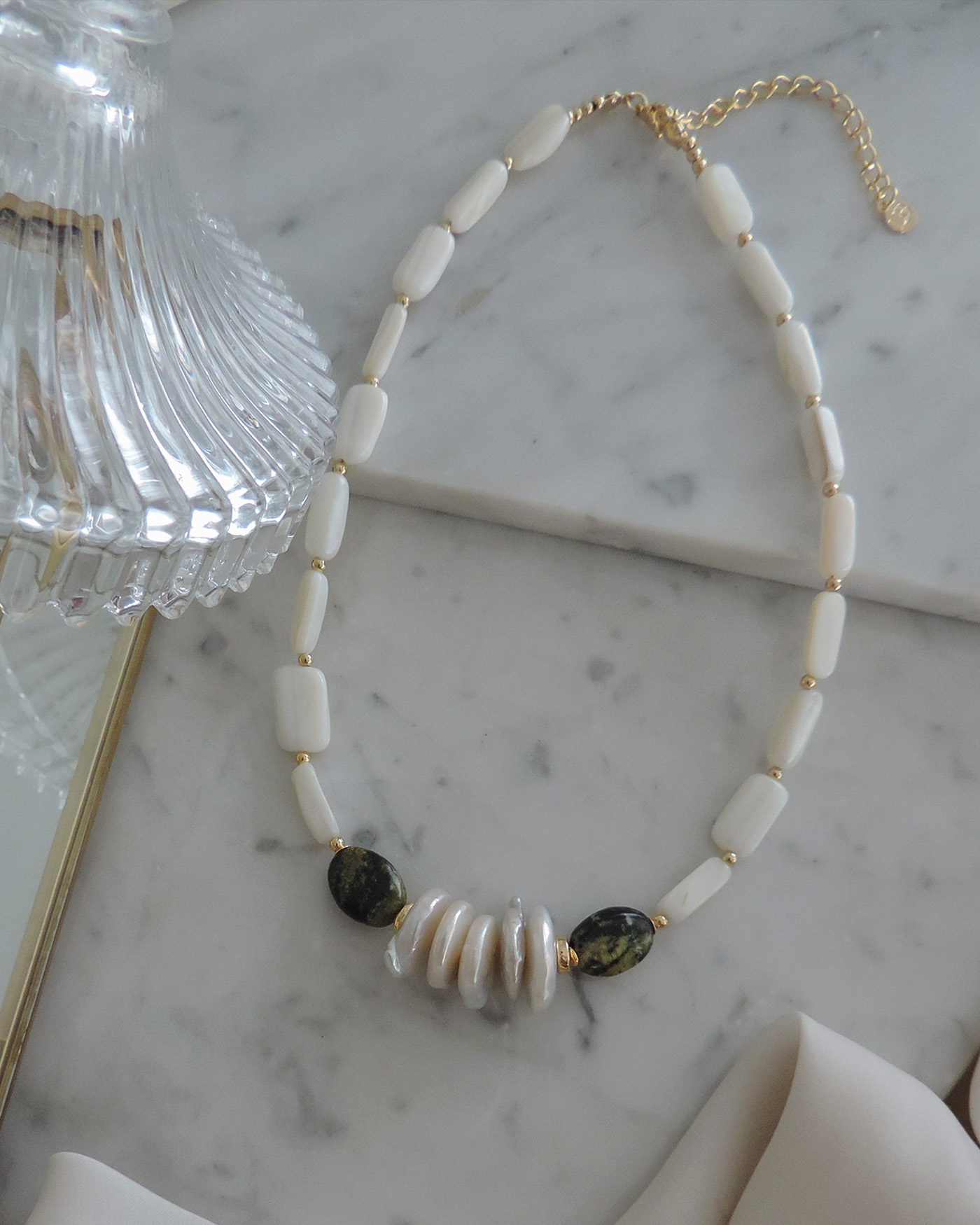 Collar realizado con piedras naturales nacar rectangular de 14mm, serpentina ovalo de 17mm y perlas de río naturales en forma de disco + cuentas y terminaciones de oro laminado hipoalergénico.