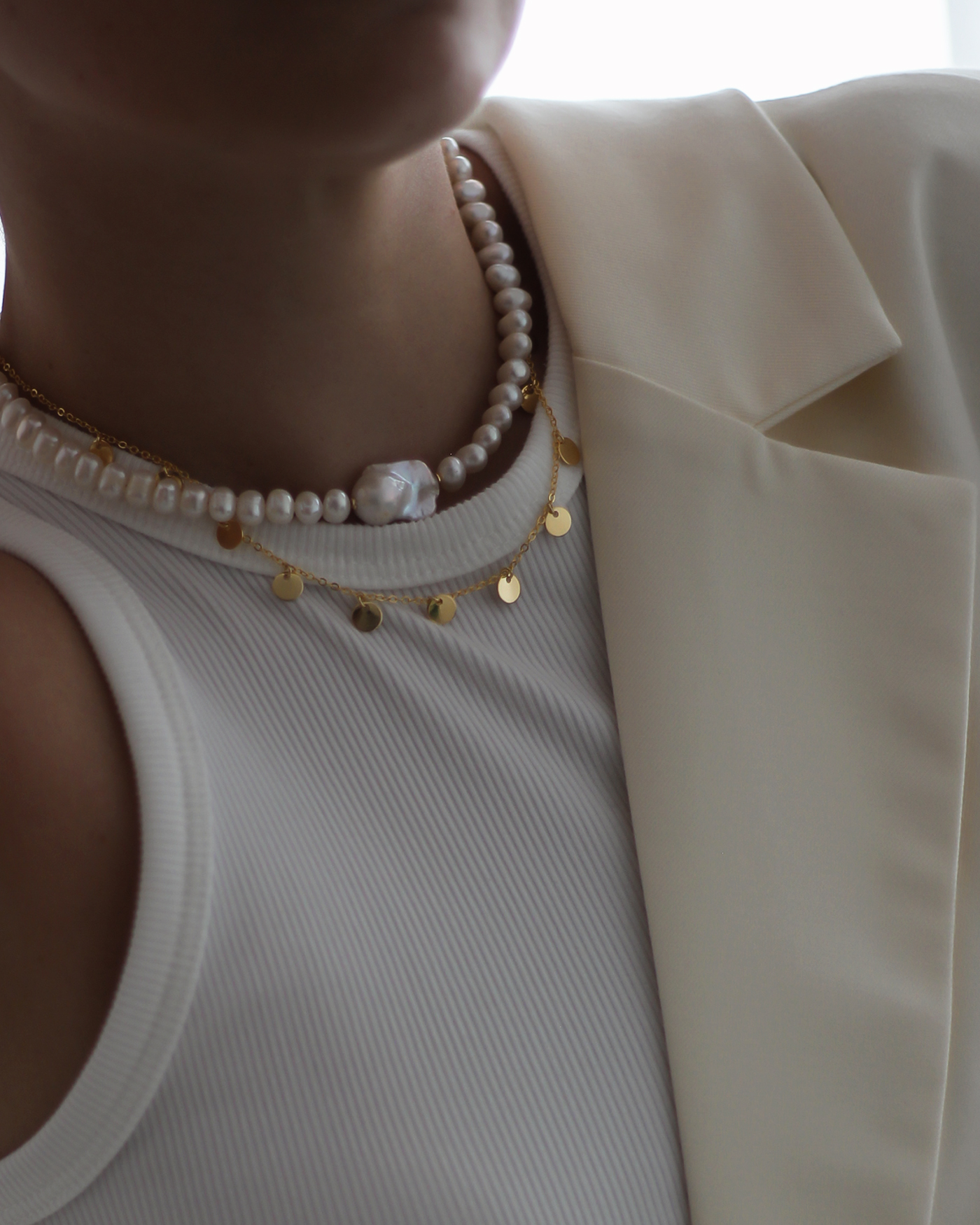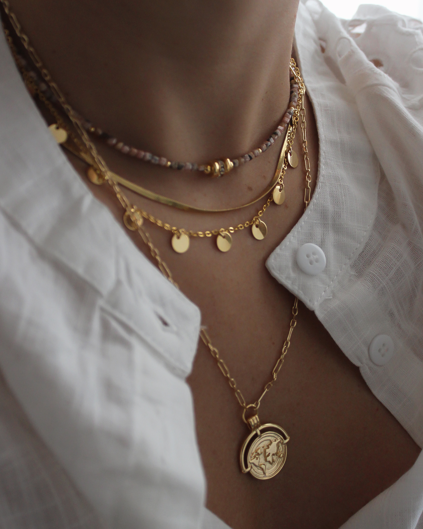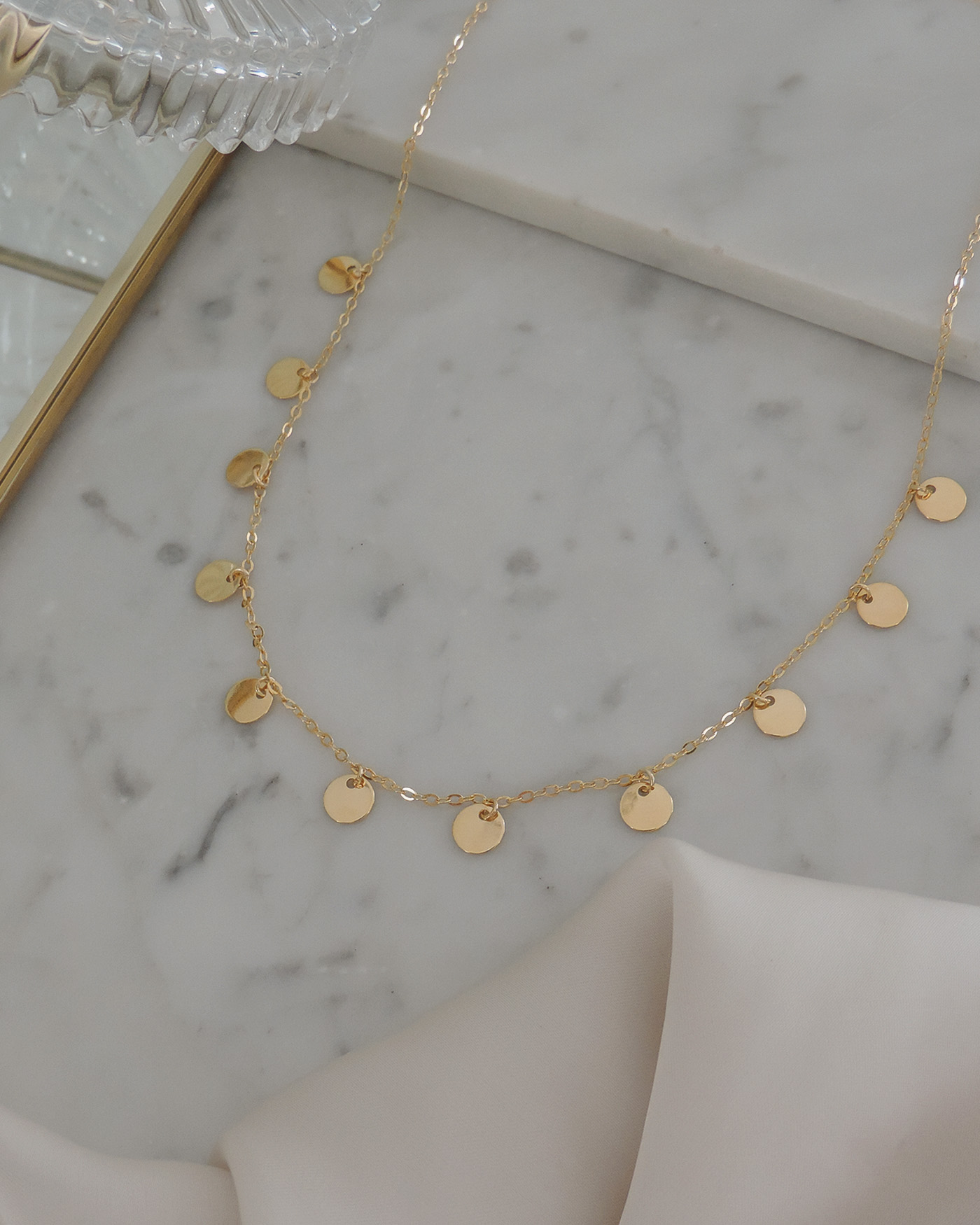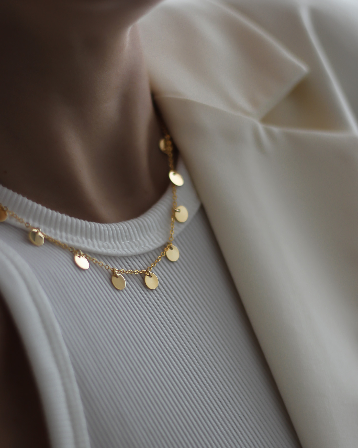 Collar flexible, realizado con cadena finita básica con moneditas de 6mm, todo de oro laminado hipoalergénico.