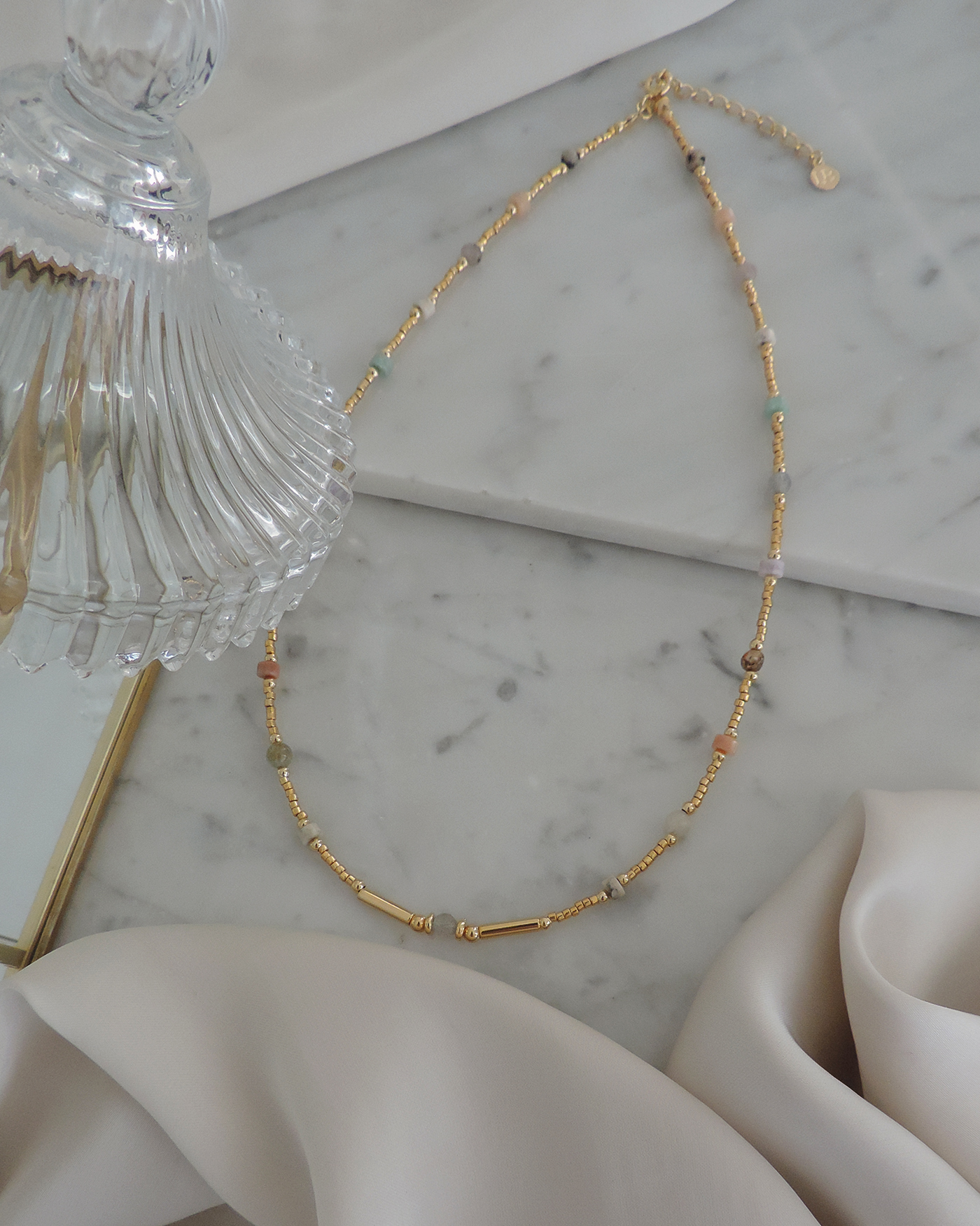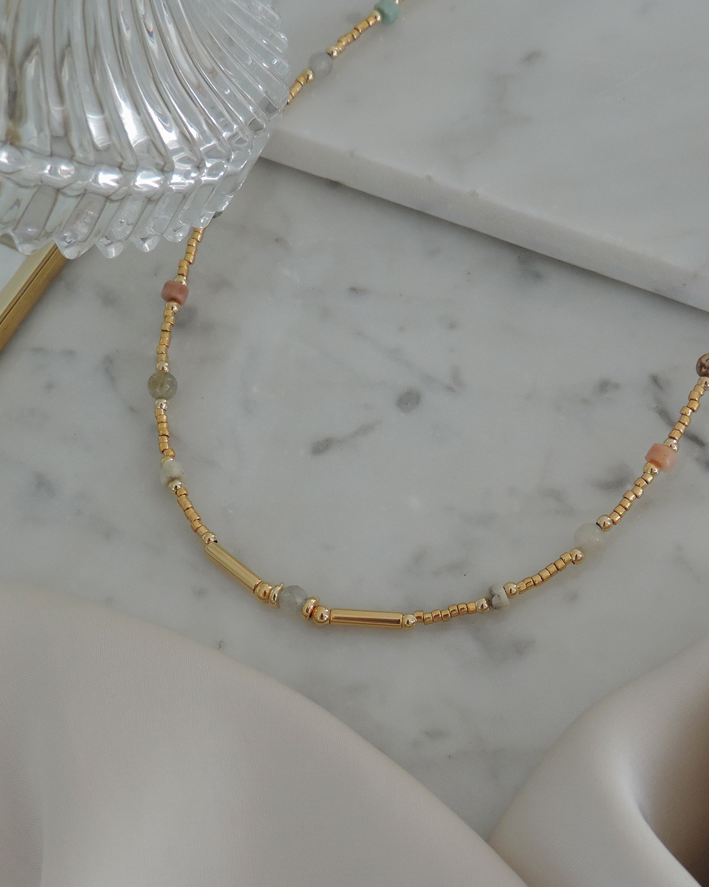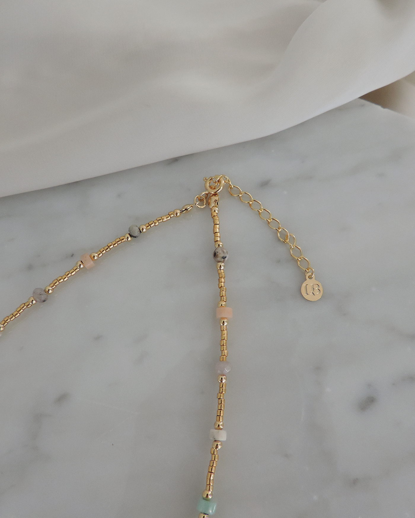 Collar flexible realizado con delicas de Miyuki galvanizadas, tubos en el centro, balines laminados en oro y piedras naturales de varios colores y formas (tonos pasteles). Terminaciones en laminado en oro hipoalergénico.