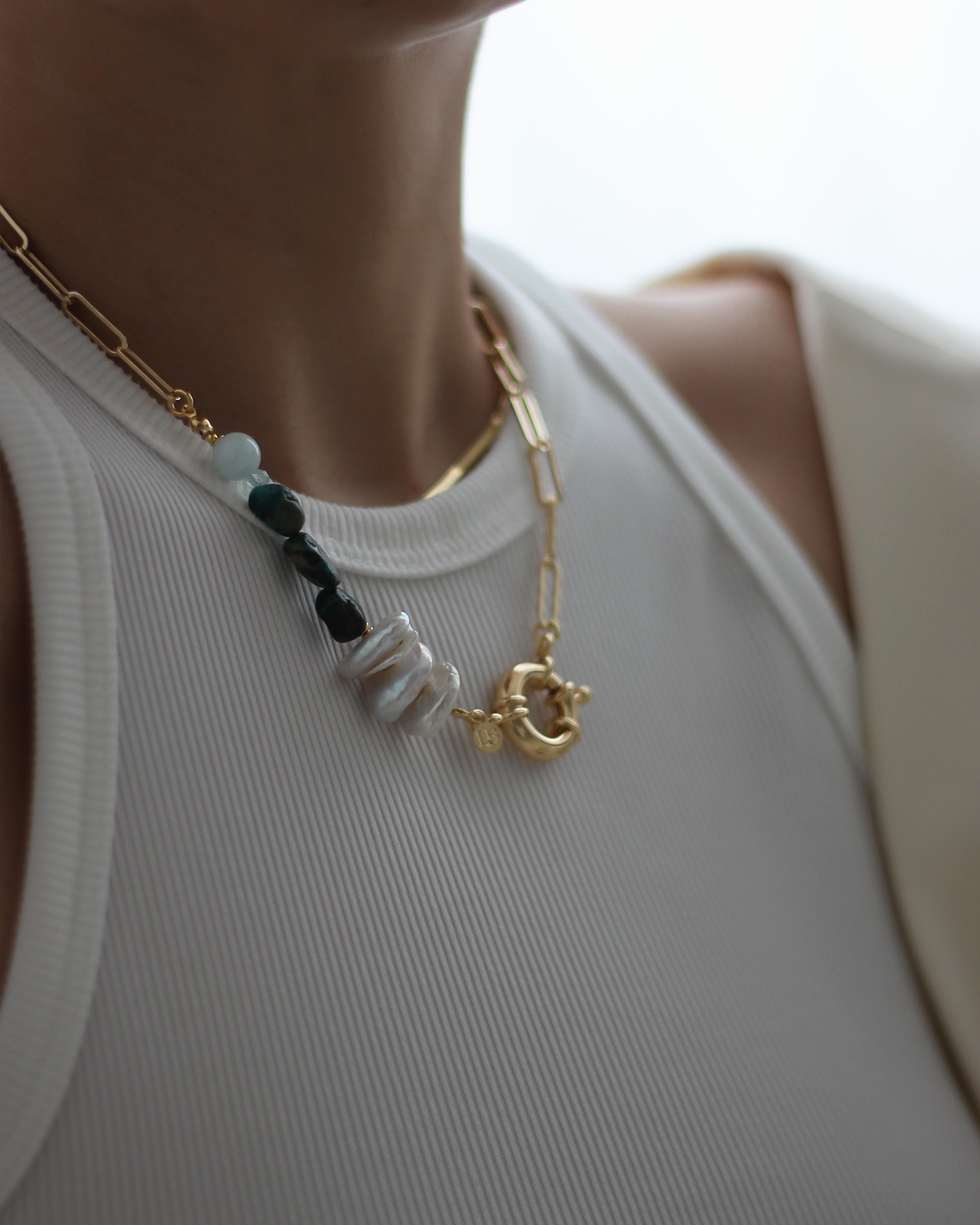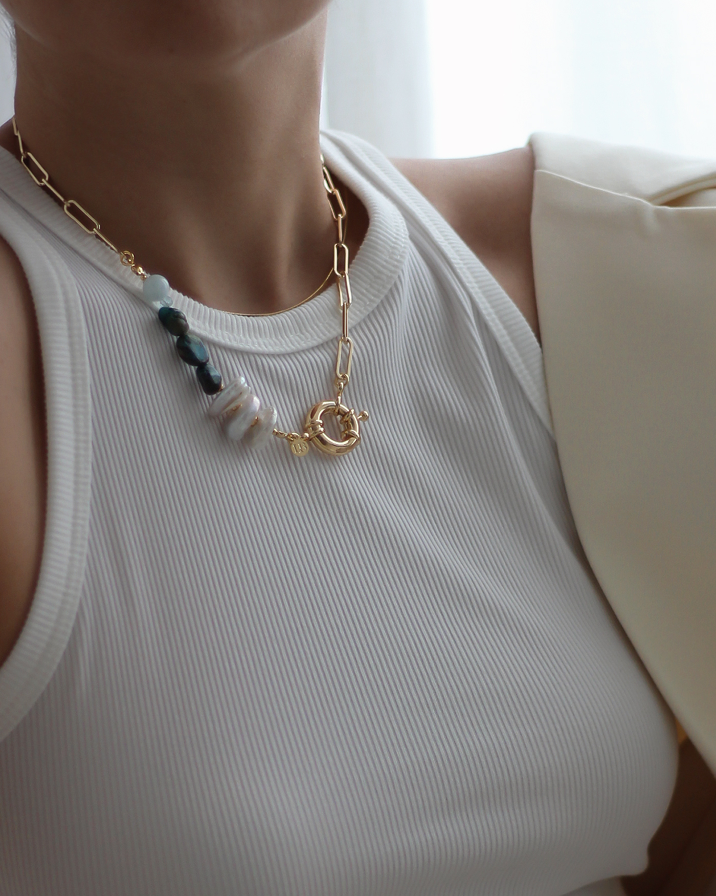 Collar realizado en cadena de eslabón rectangular de 14mm con broche marinero de 19mm + perlas naturales dona y piedra aguamarina de 8mm aprox. y turquesa natural teñida. Terminaciones en oro laminado hipoalergénico. (Las perlas pueden variar su brillo y forma ya que son naturales).