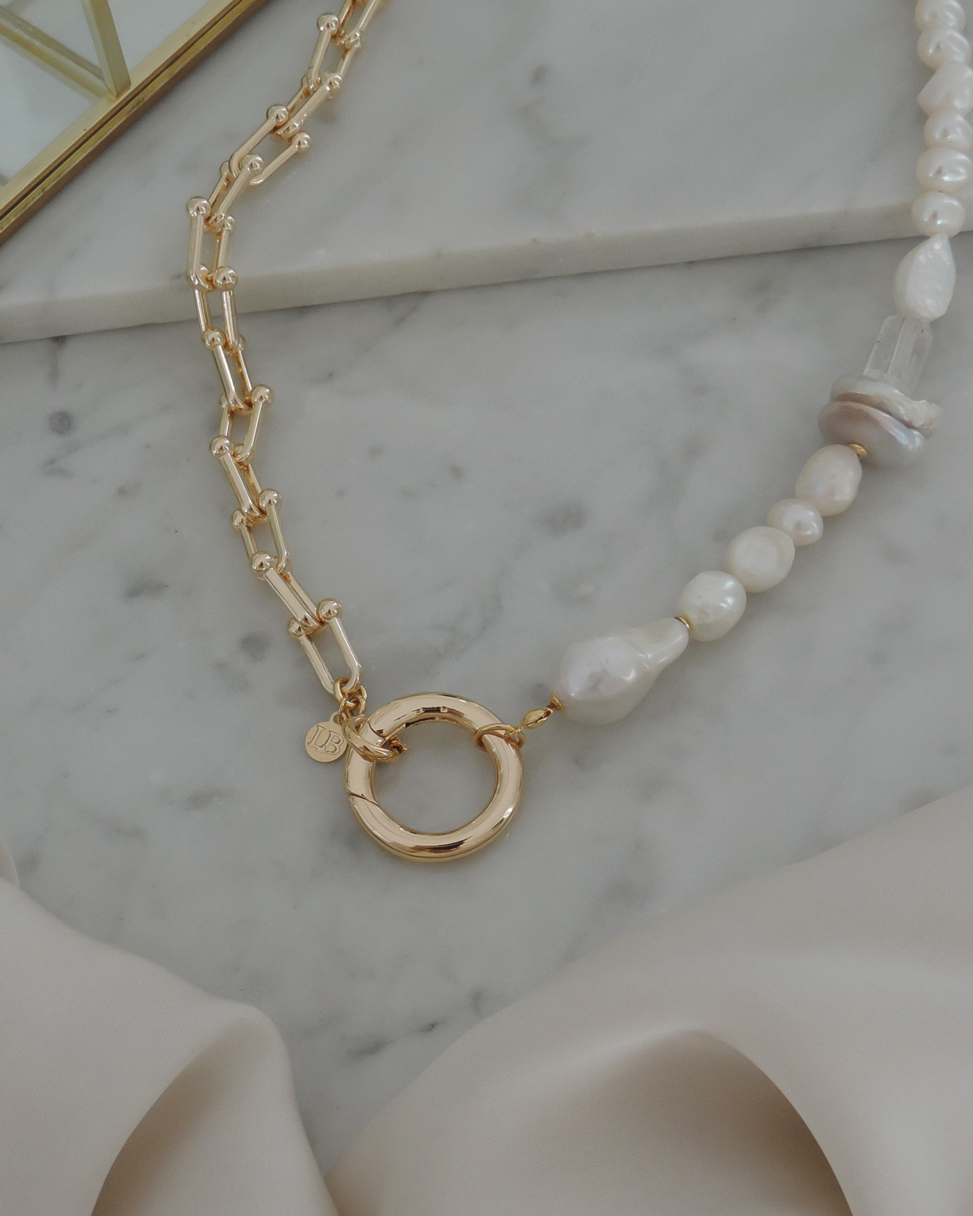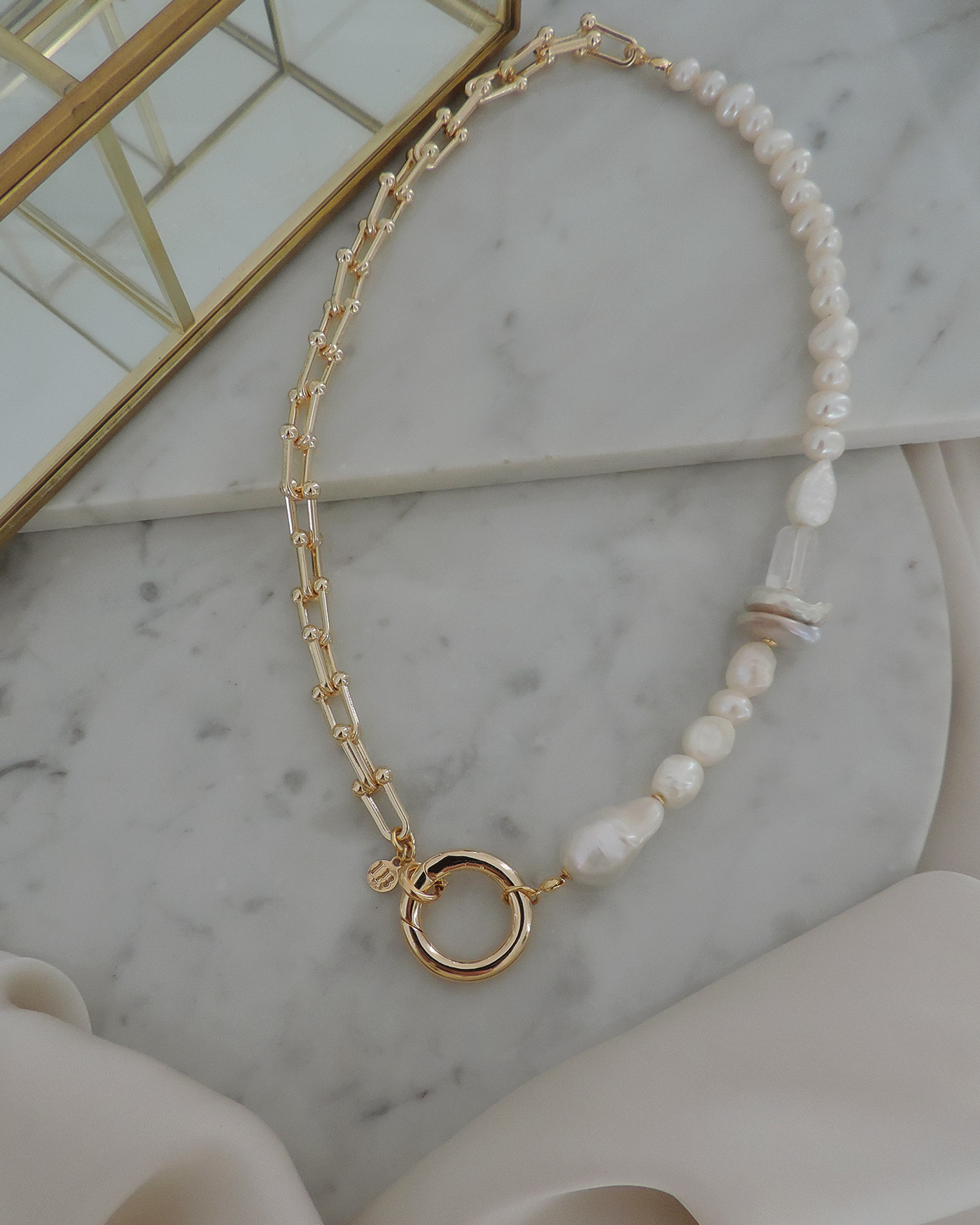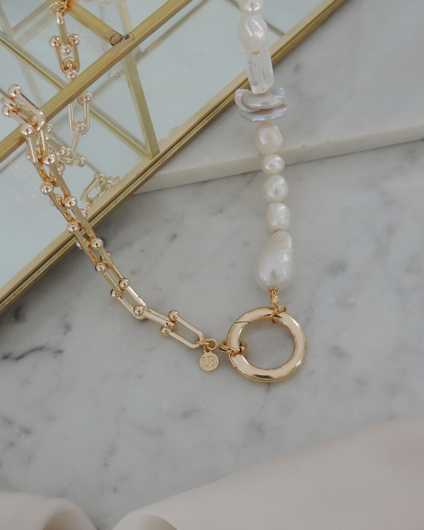 Collar realizado mitad con cadena tipo Tiffany y la otra mitad en perlas naturales varias y piedra cuarzo, en el centro broche circulo macizo 23mm. Todo laminado en oro hipoalergénico.