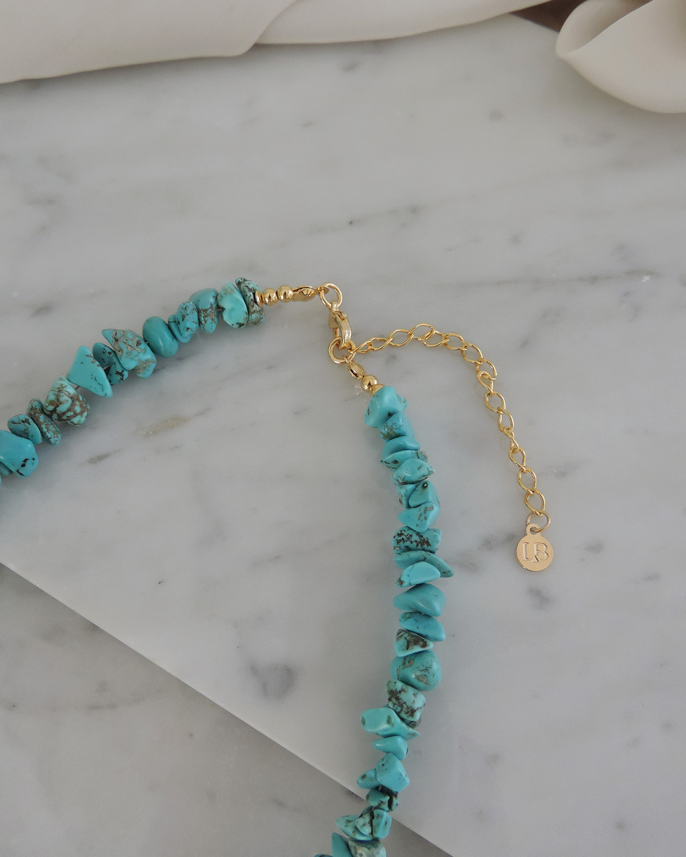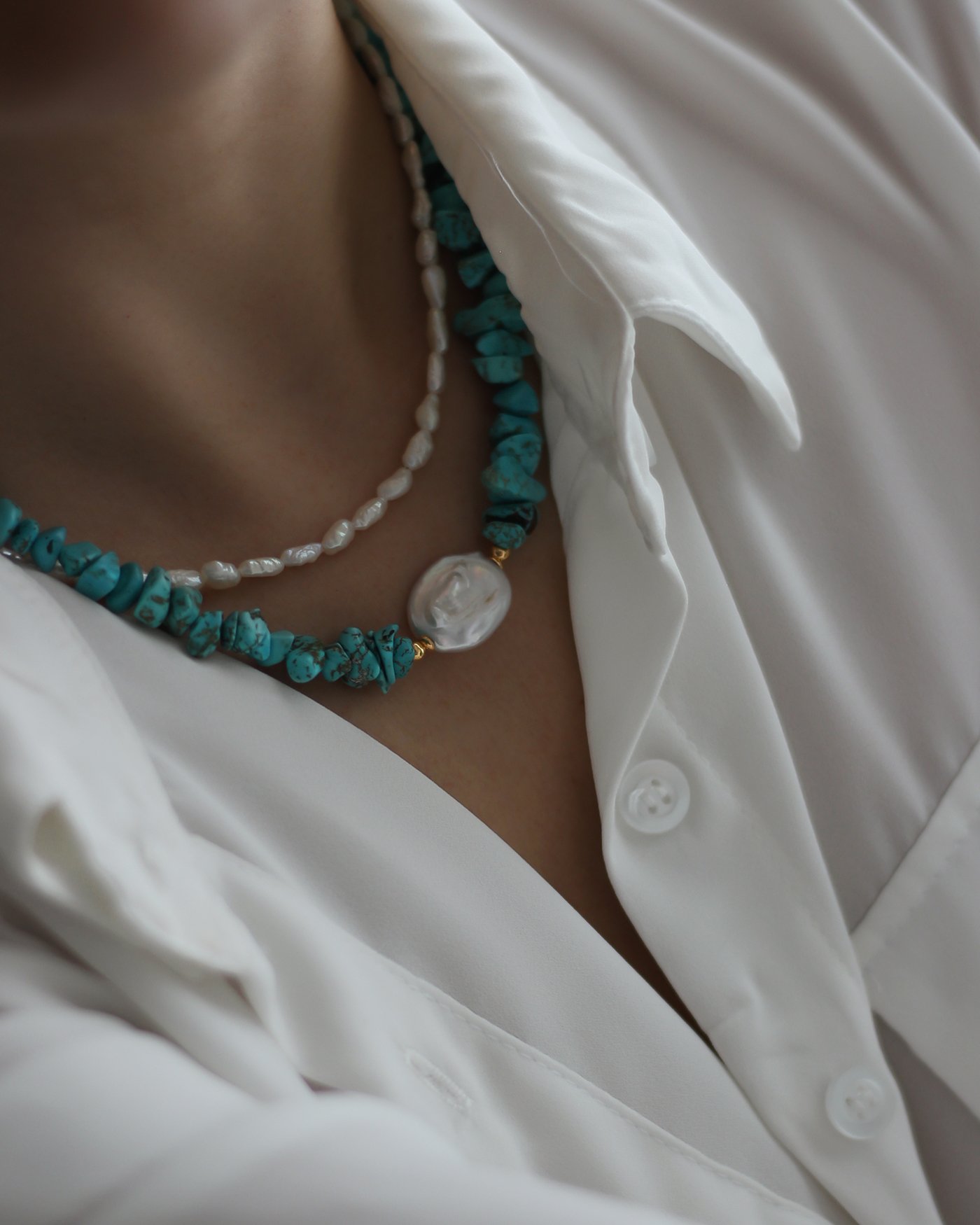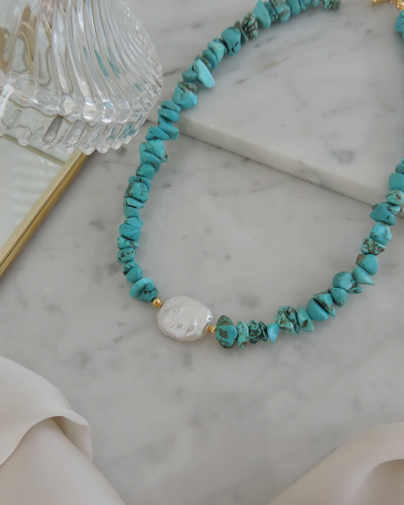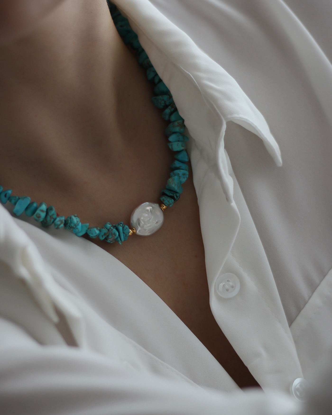 Collar flexible, realizado con piedras naturales turquesa escalla + perla natural en cetro de 20mm + cuentas y terminaciones de oro laminado hipoalergénico.