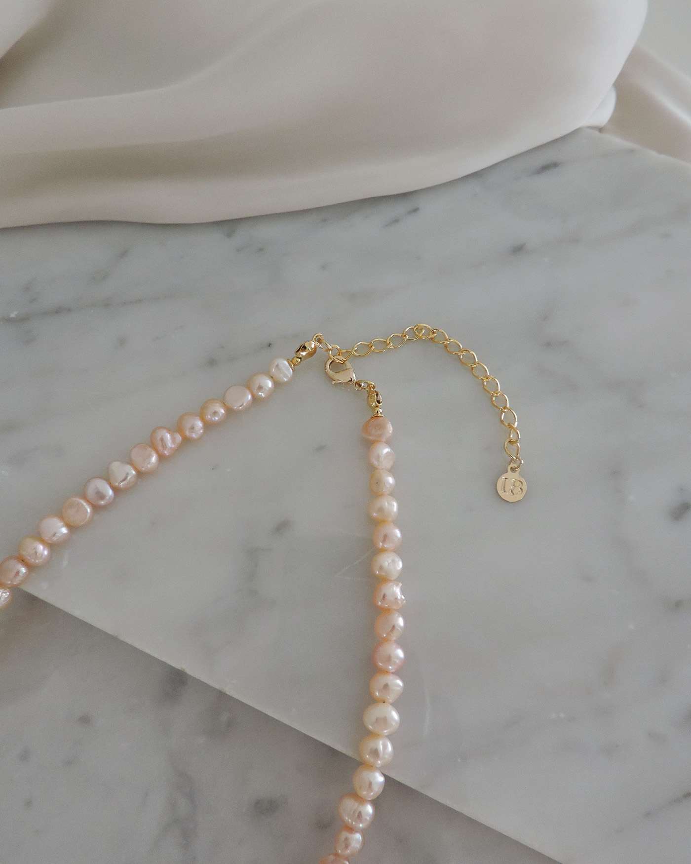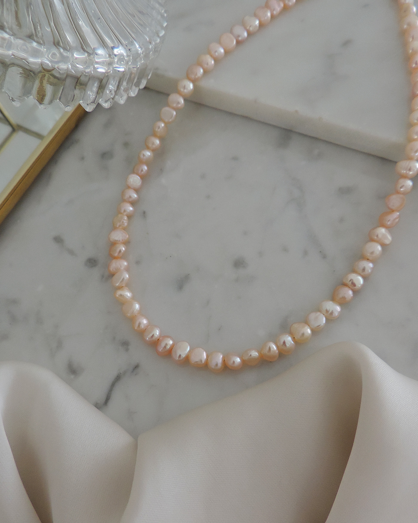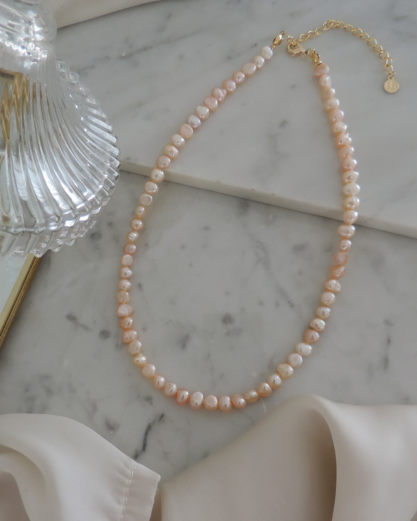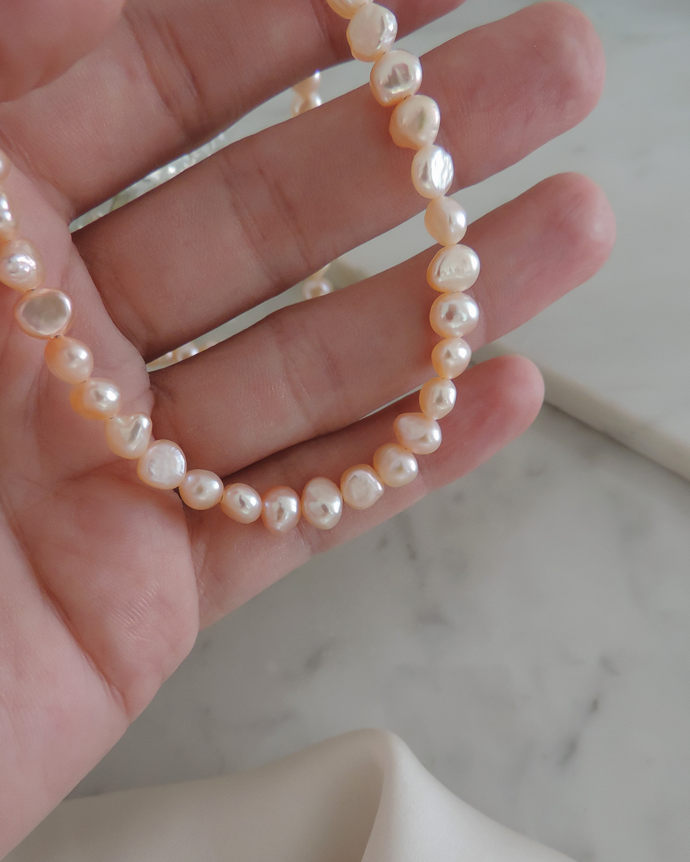 Collar tipo gargantilla en perlas de río naturales prémium, irregulares de 5mm aprox. tono rosa salmón realizado con tanza flexible. Terminaciones en oro laminado hipoalergénico. (Las perlas pueden variar su brillo, forma ya que son perlas naturales).