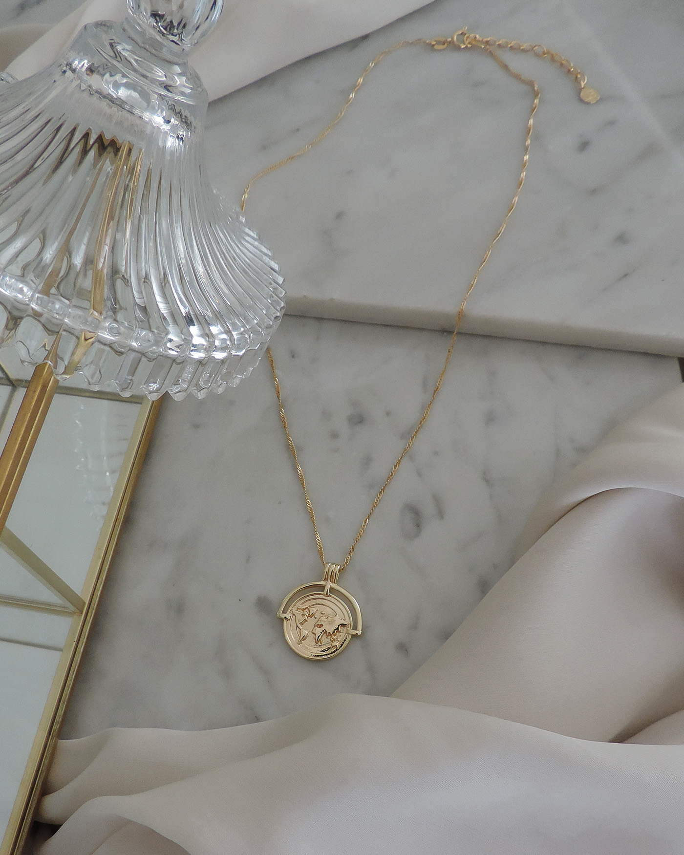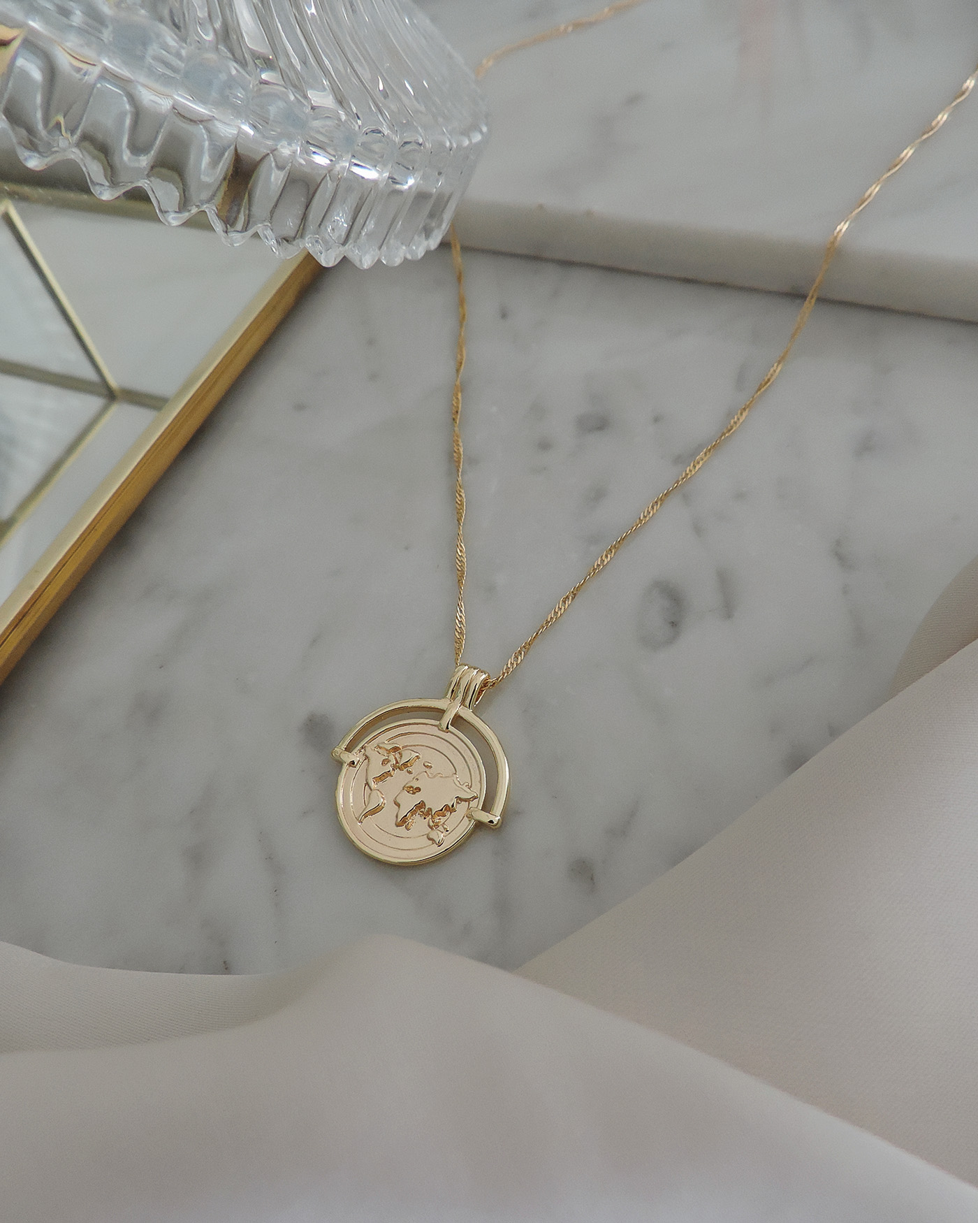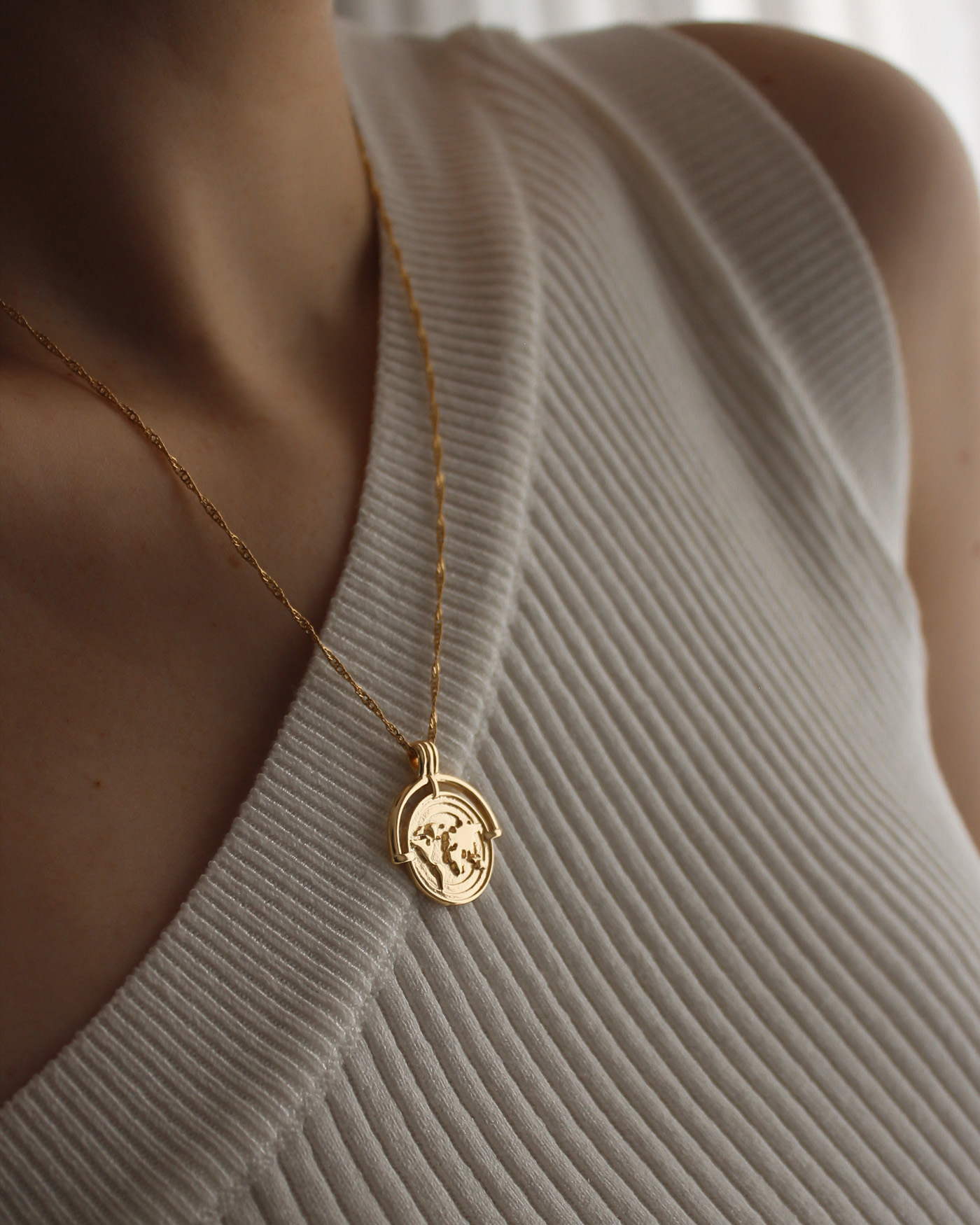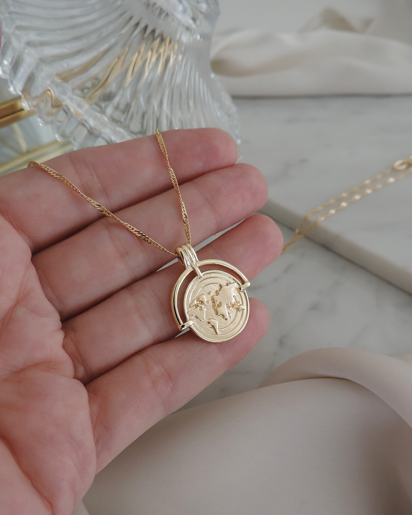 Collar realizado con cadena super finita torneada, muy delicada + dije medalla mundo de 25mm. Todo en laminado en oro hipoalergénico. Un básico!