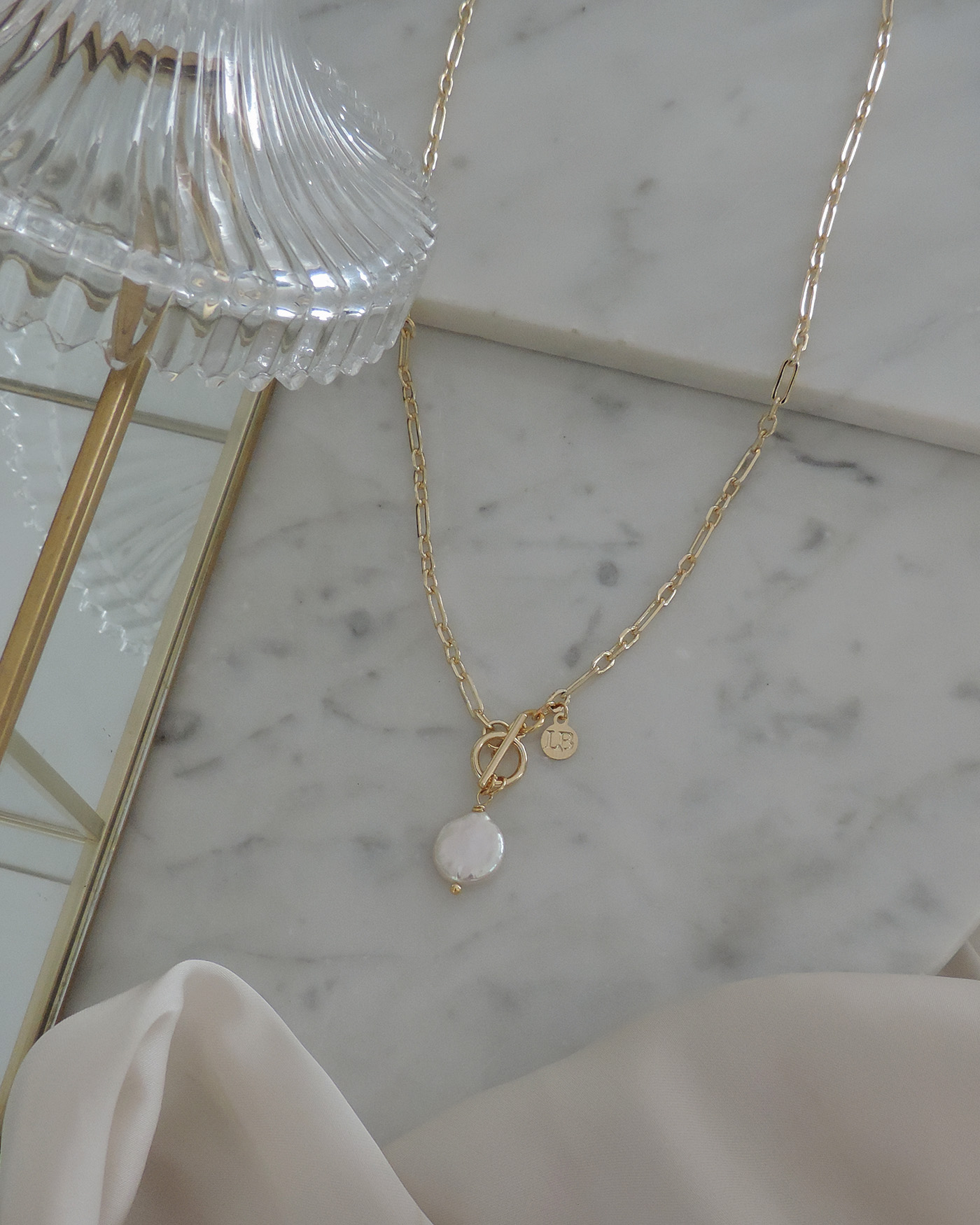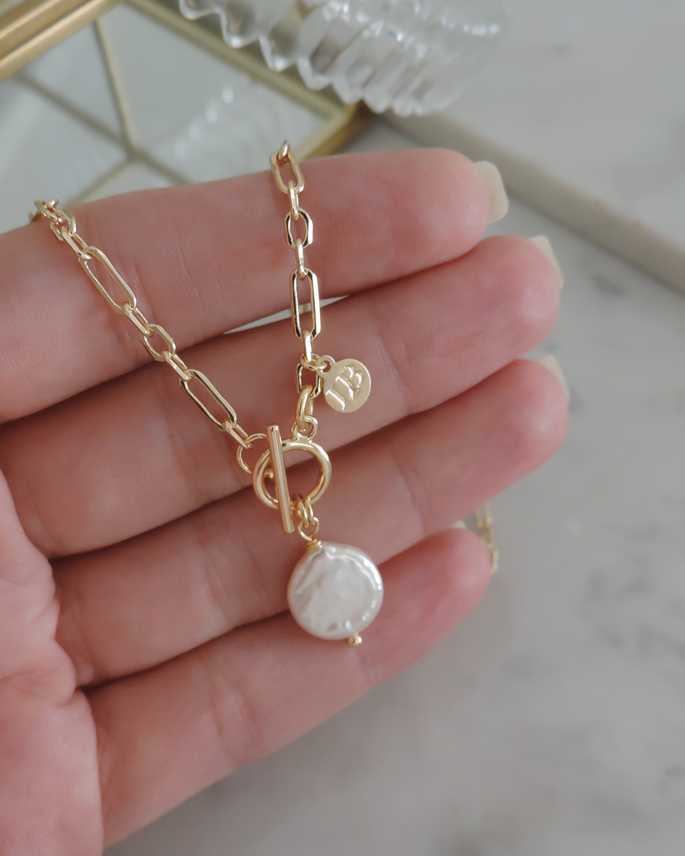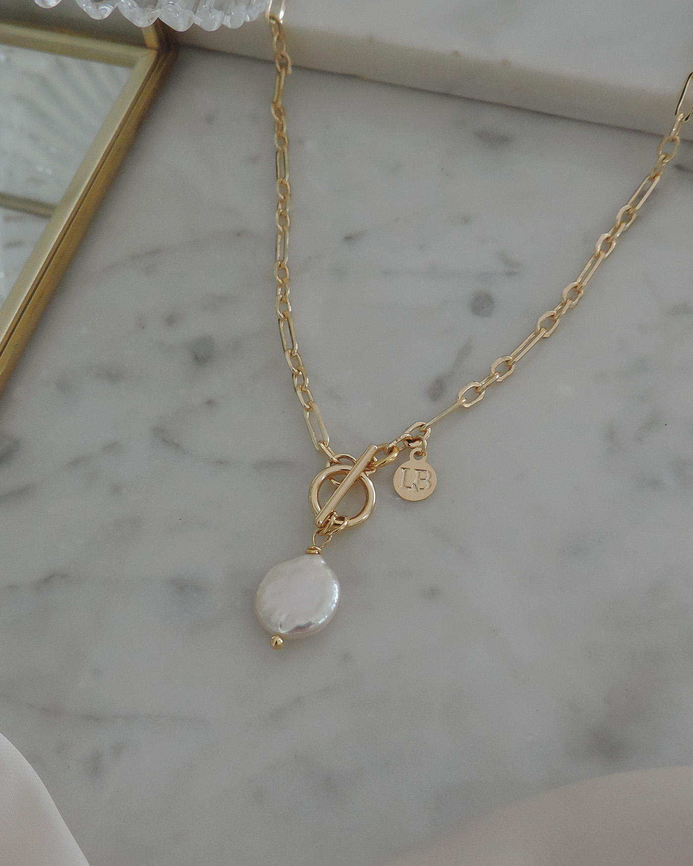 Collar realizado con cadena de eslabón rectangular combinada + broche palanca marinero + dije perla de río natural de 10mm. Todo laminado en oro hipoalergénico. (El tono, forma y brillo de la perla puede variar ya que son naturales)