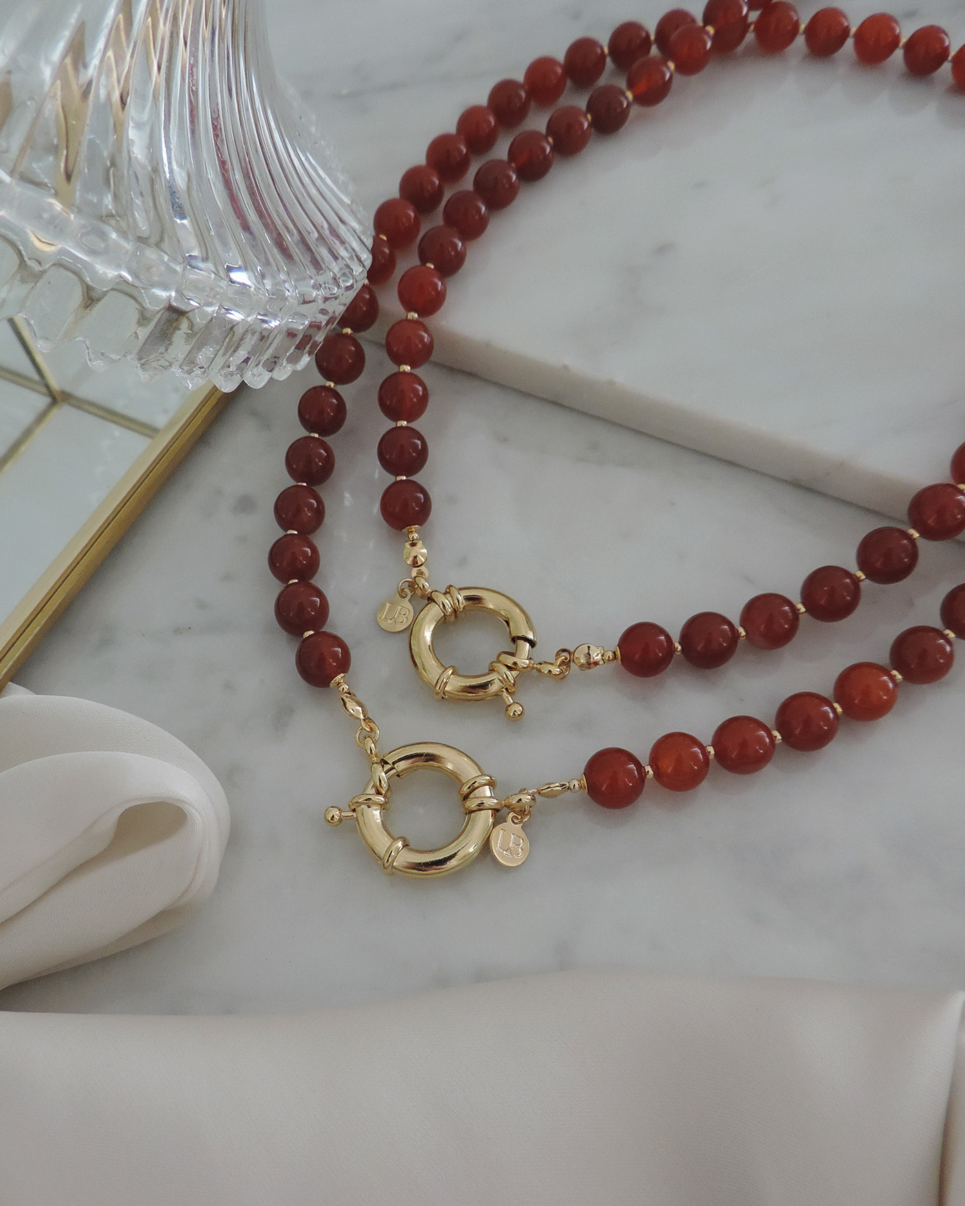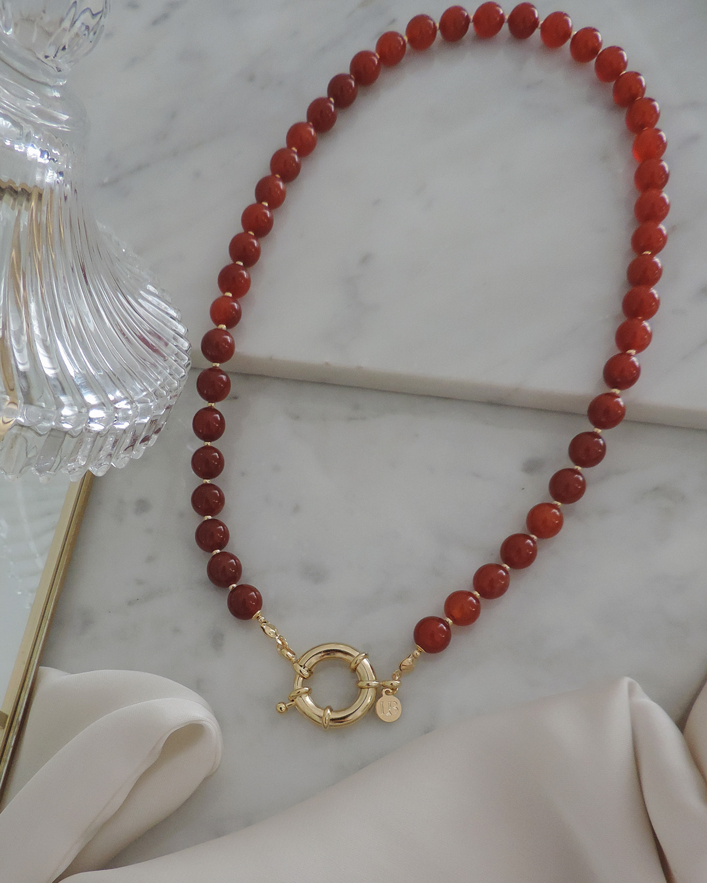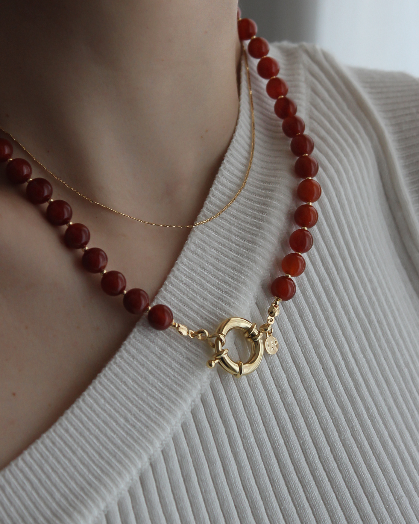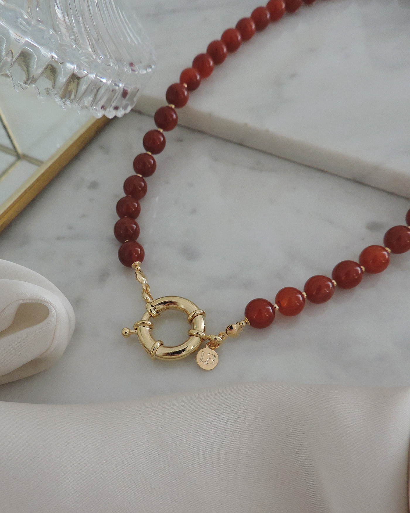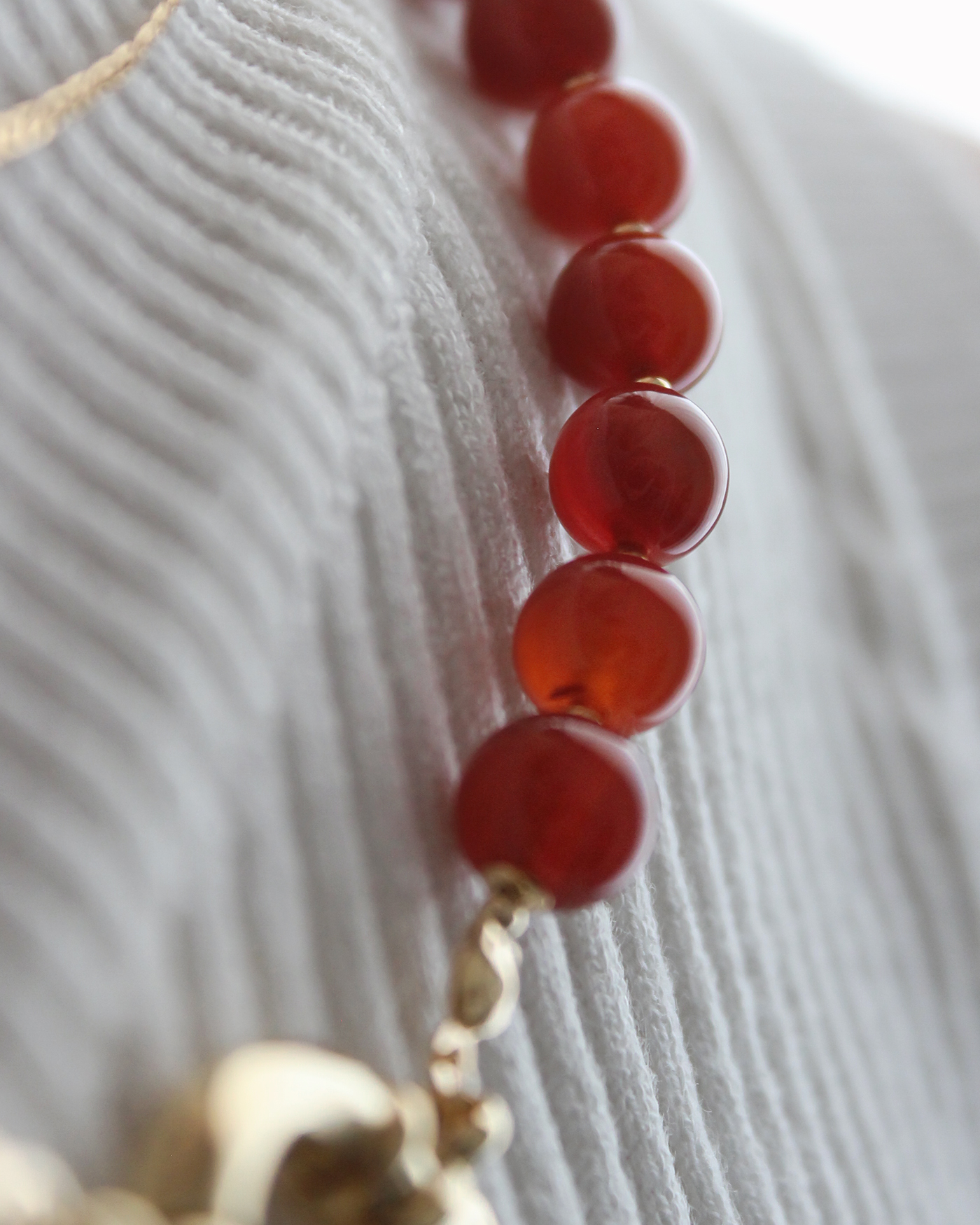 Collar flexible, realizado con piedras naturales ágata roja en forma redonda lisa de 8mmø y broche cierre marinero de 19mm + cuentas y terminaciones de oro laminado hipoalergénico.