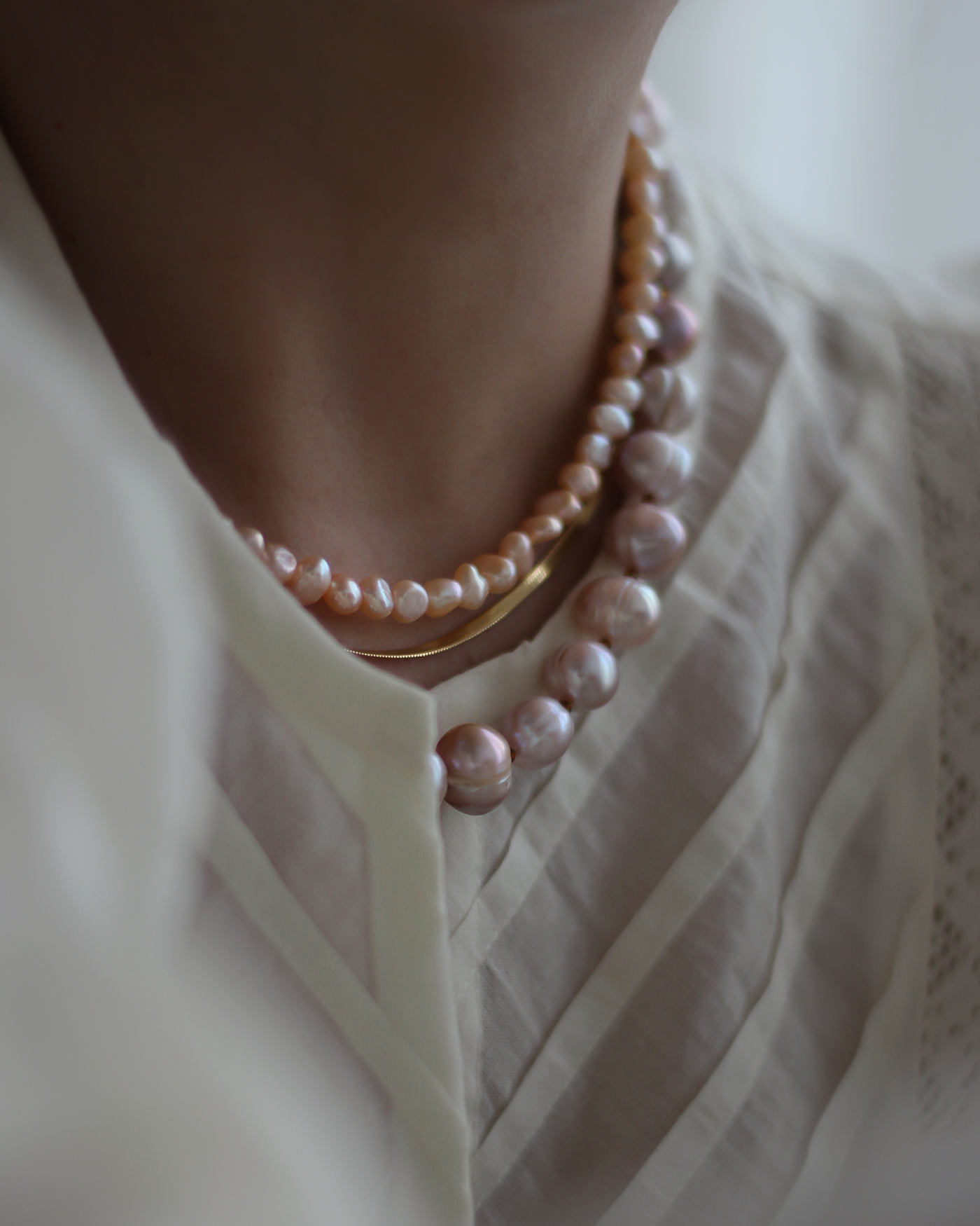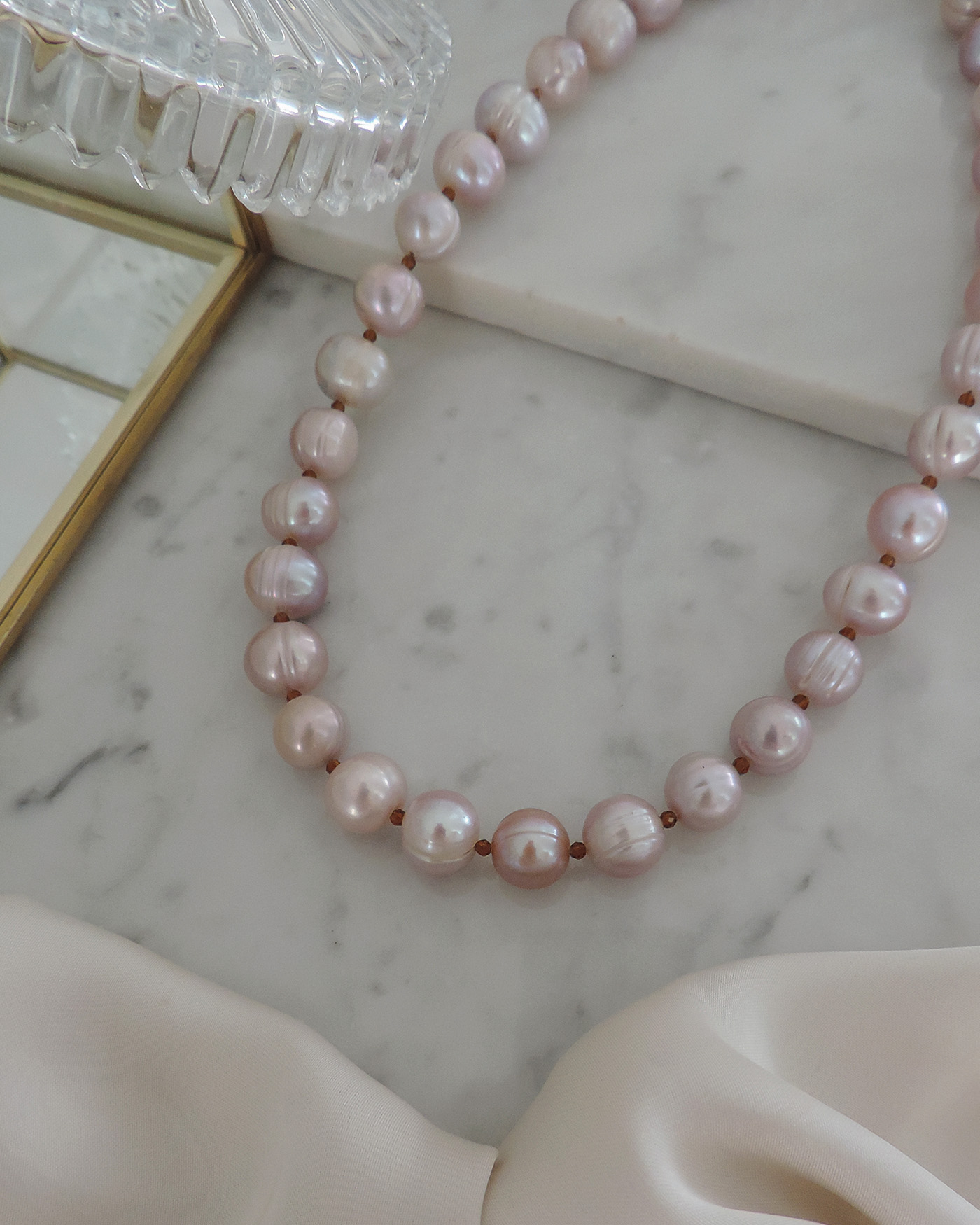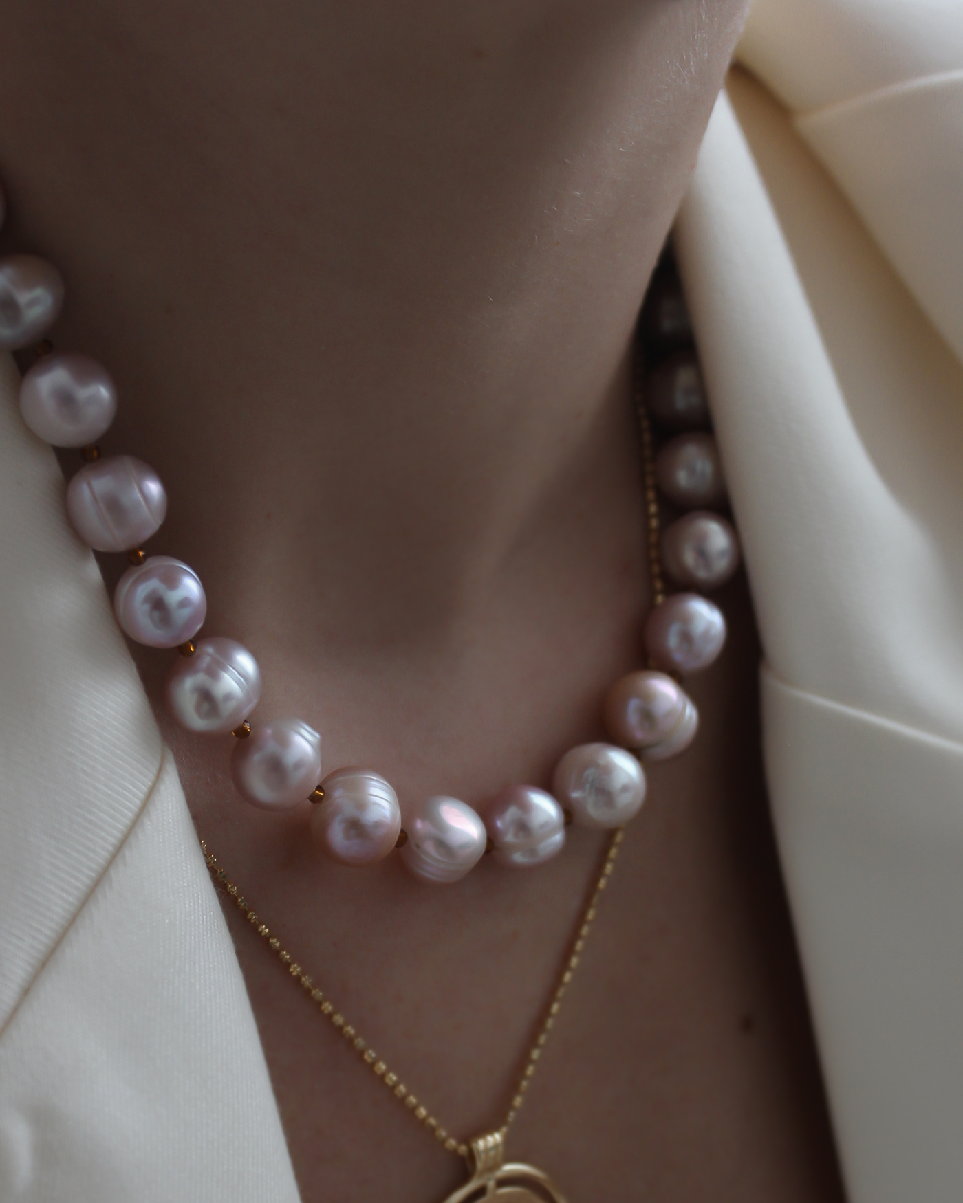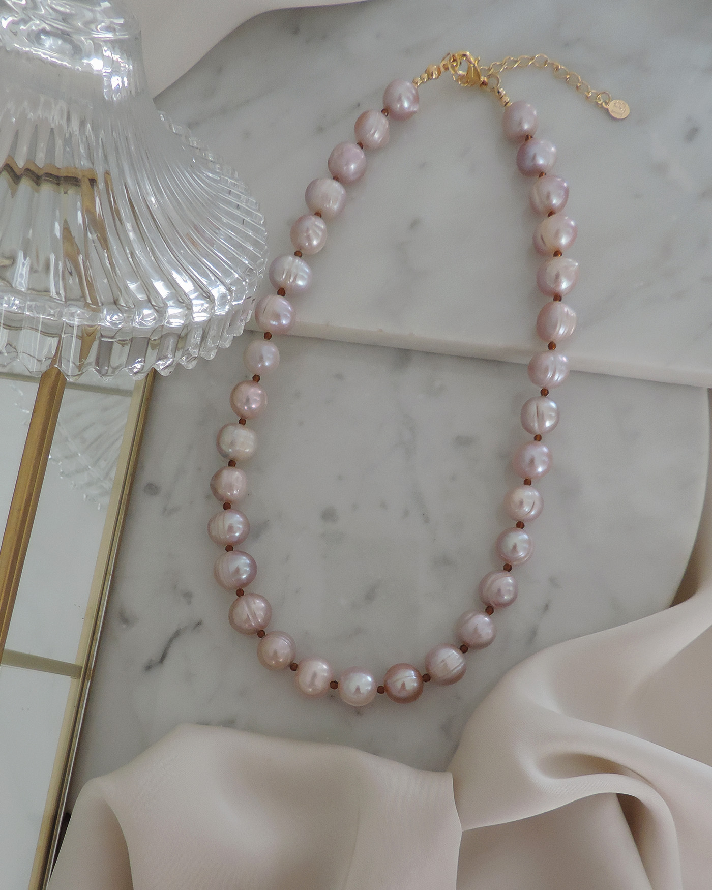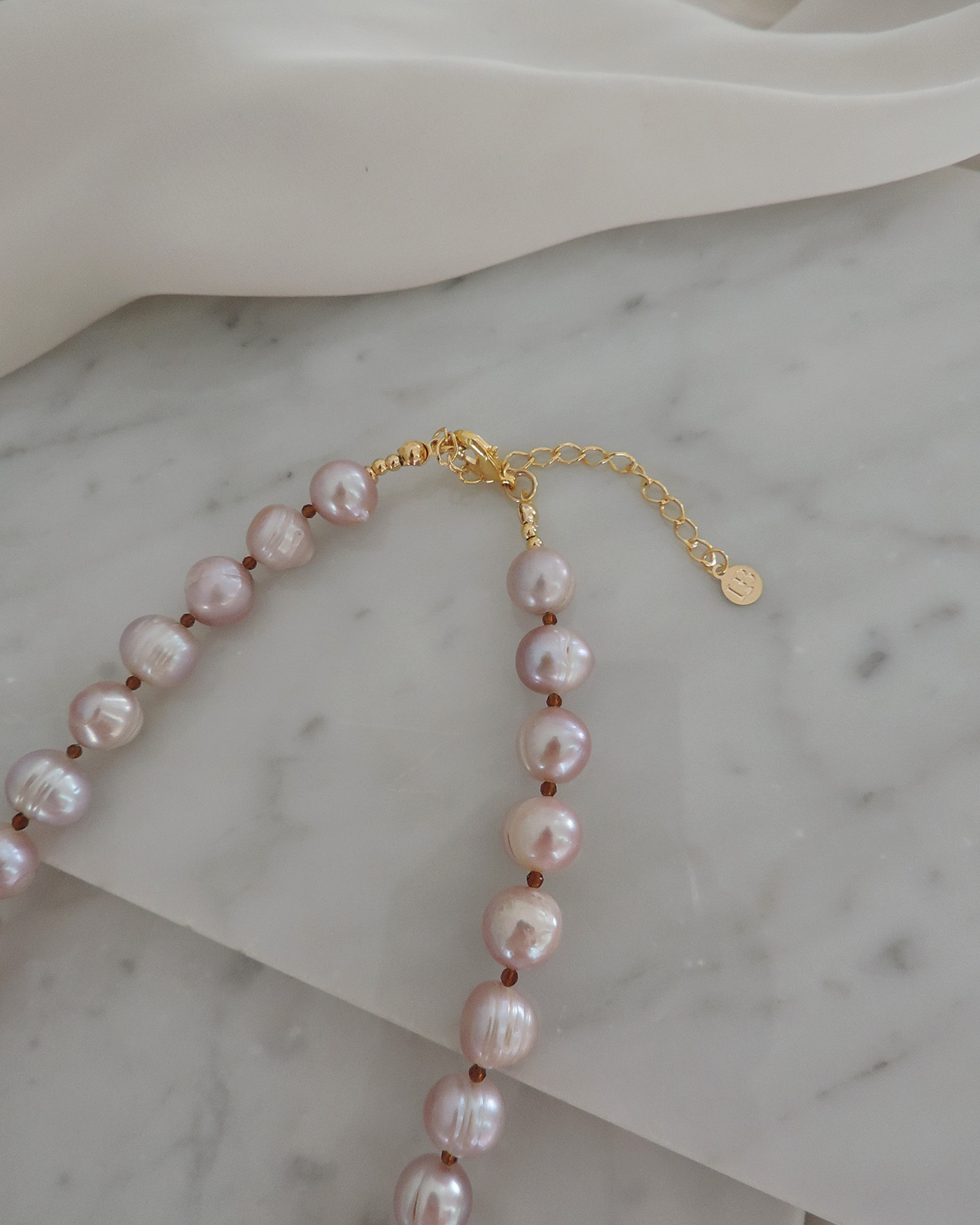 Collar flexible, realizado con perlas naturales en tono rosa lila de 8/9mm y piedritas mini morrón + cuentas y terminaciones de oro laminado hipoalergénico.