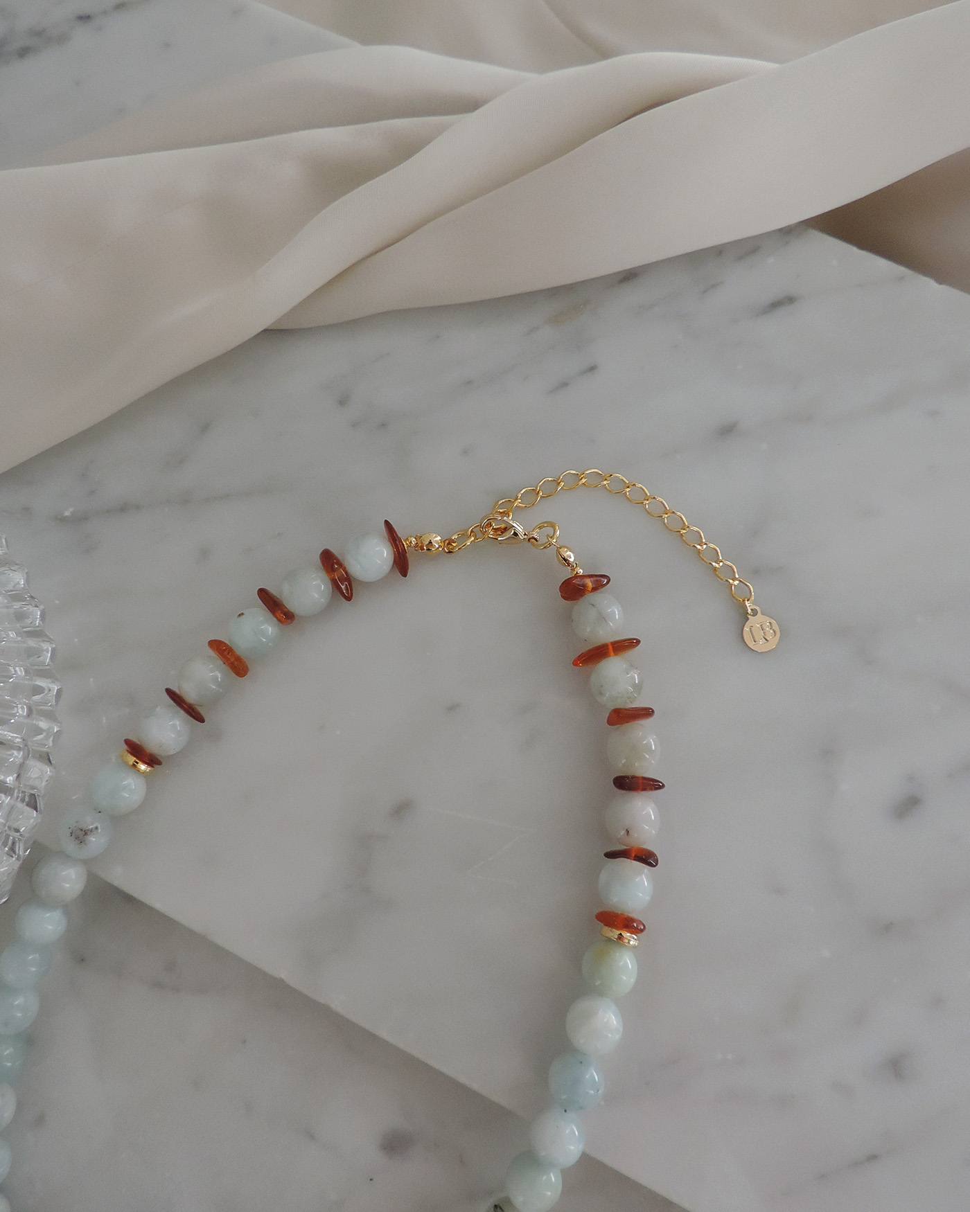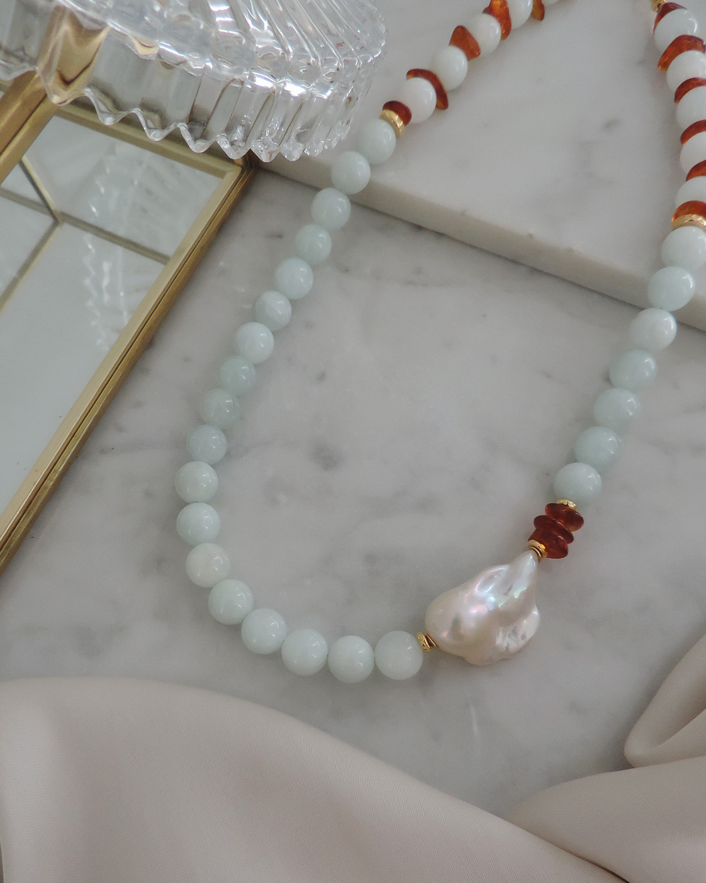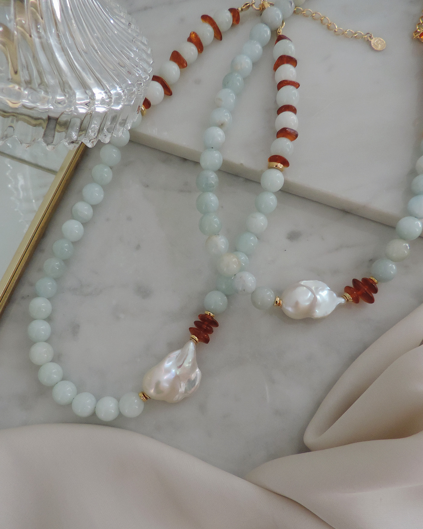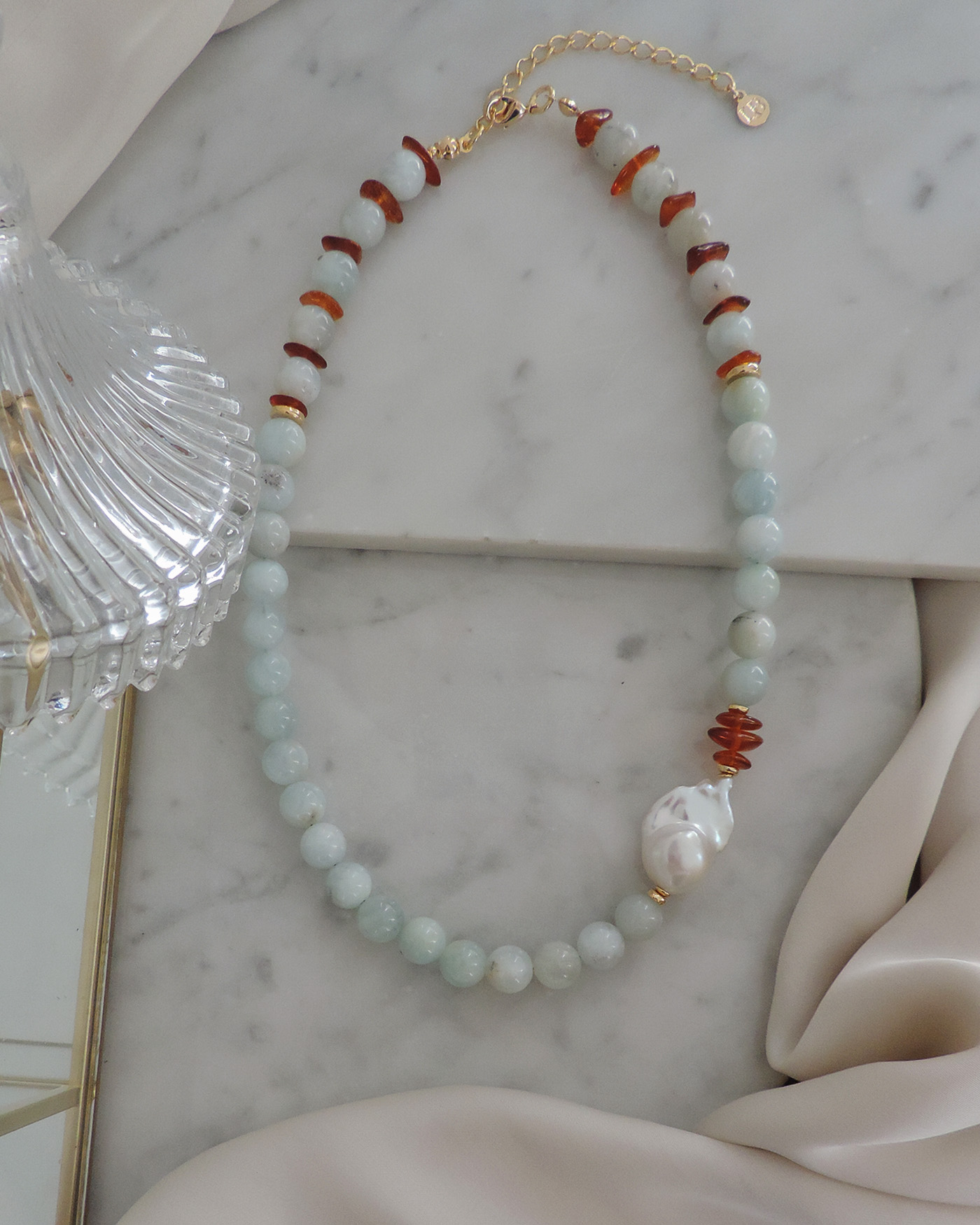 Collar tipo gargantilla en piedras naturales aguamarina esfera lisa de 8mm aprox. con detalle lateral de perla natural barroca de 19/21mm y escallas de ámbar natural, realizado con tanza flexible. Terminaciones en oro laminado hipoalergénico. (La perla puede variar su brillo y forma ya que es natural).
