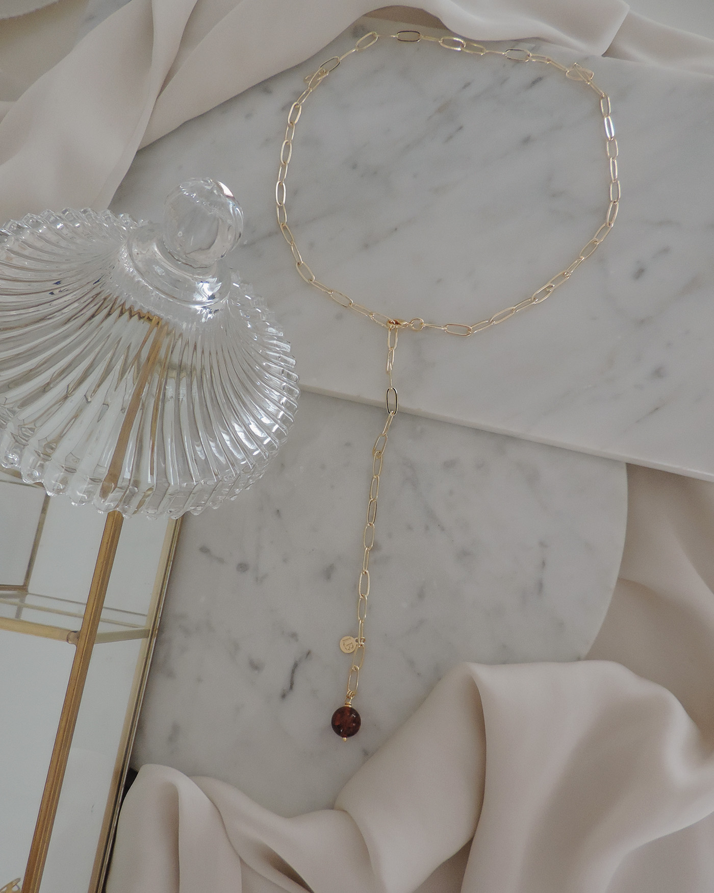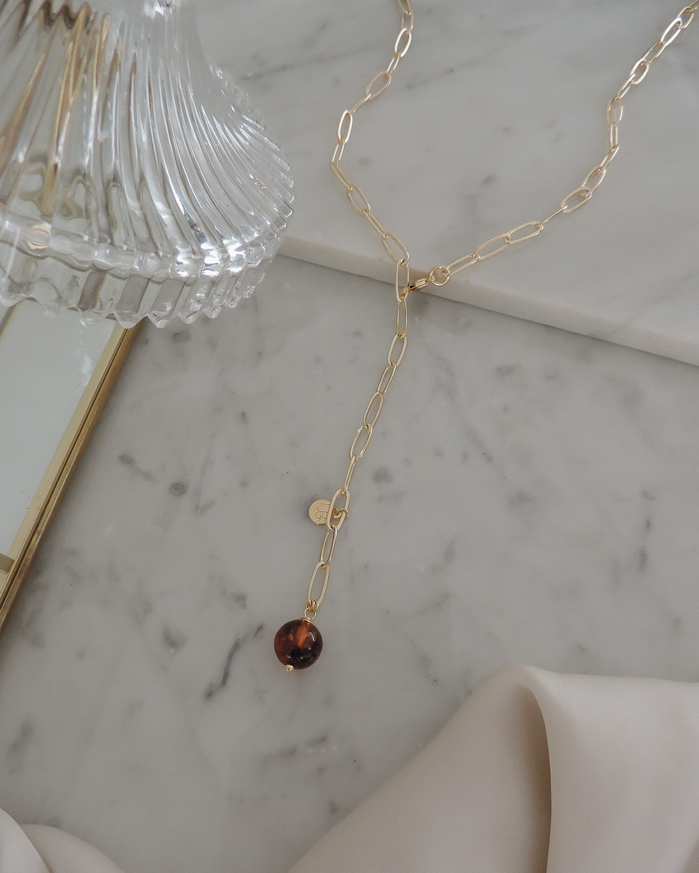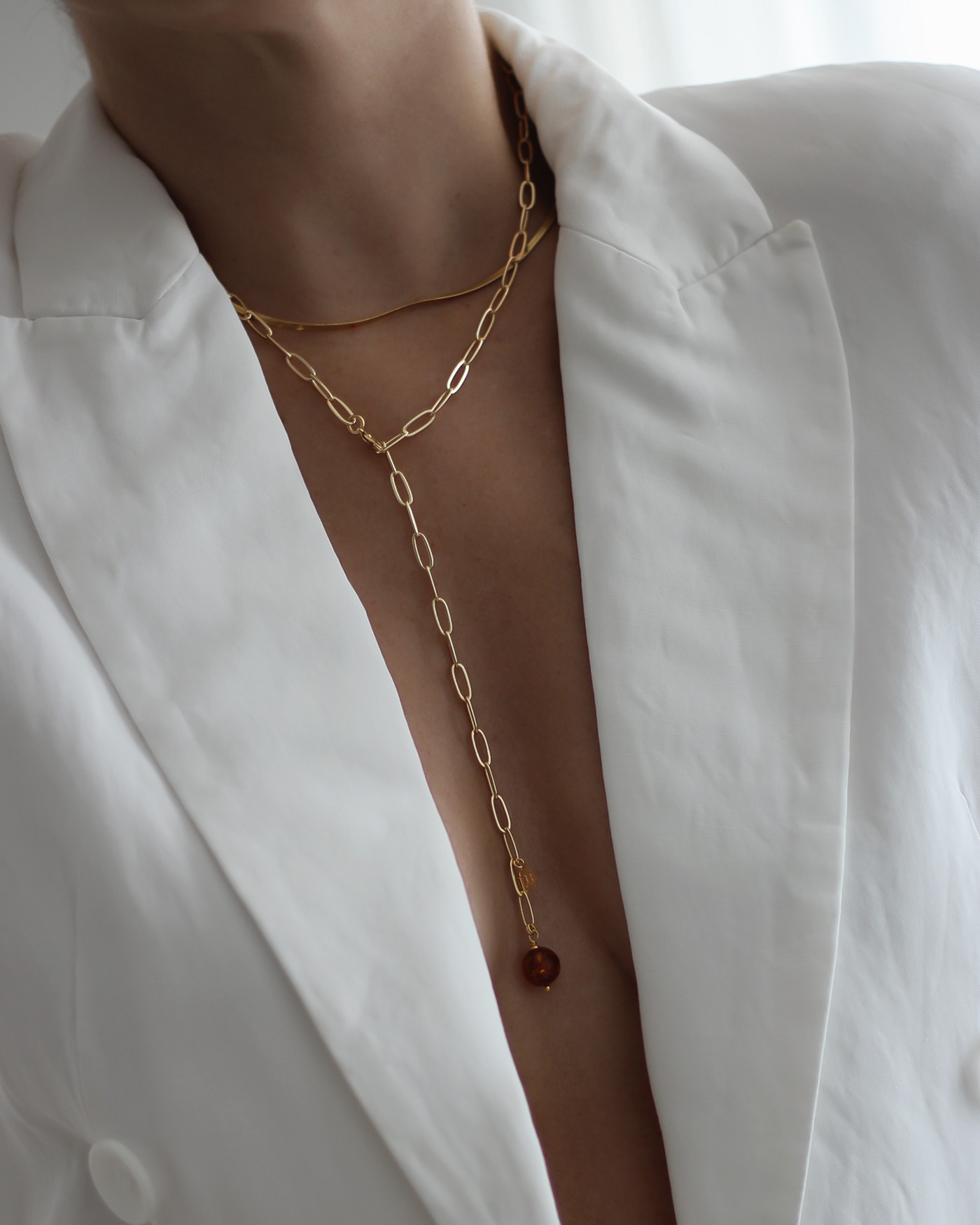 Collar tipo corbatero, realizado con cadena de eslabón rectangular de 10mm  y dije piedra bola ambar natural de 10mm. Todo en laminado en oro hipoalergénico.