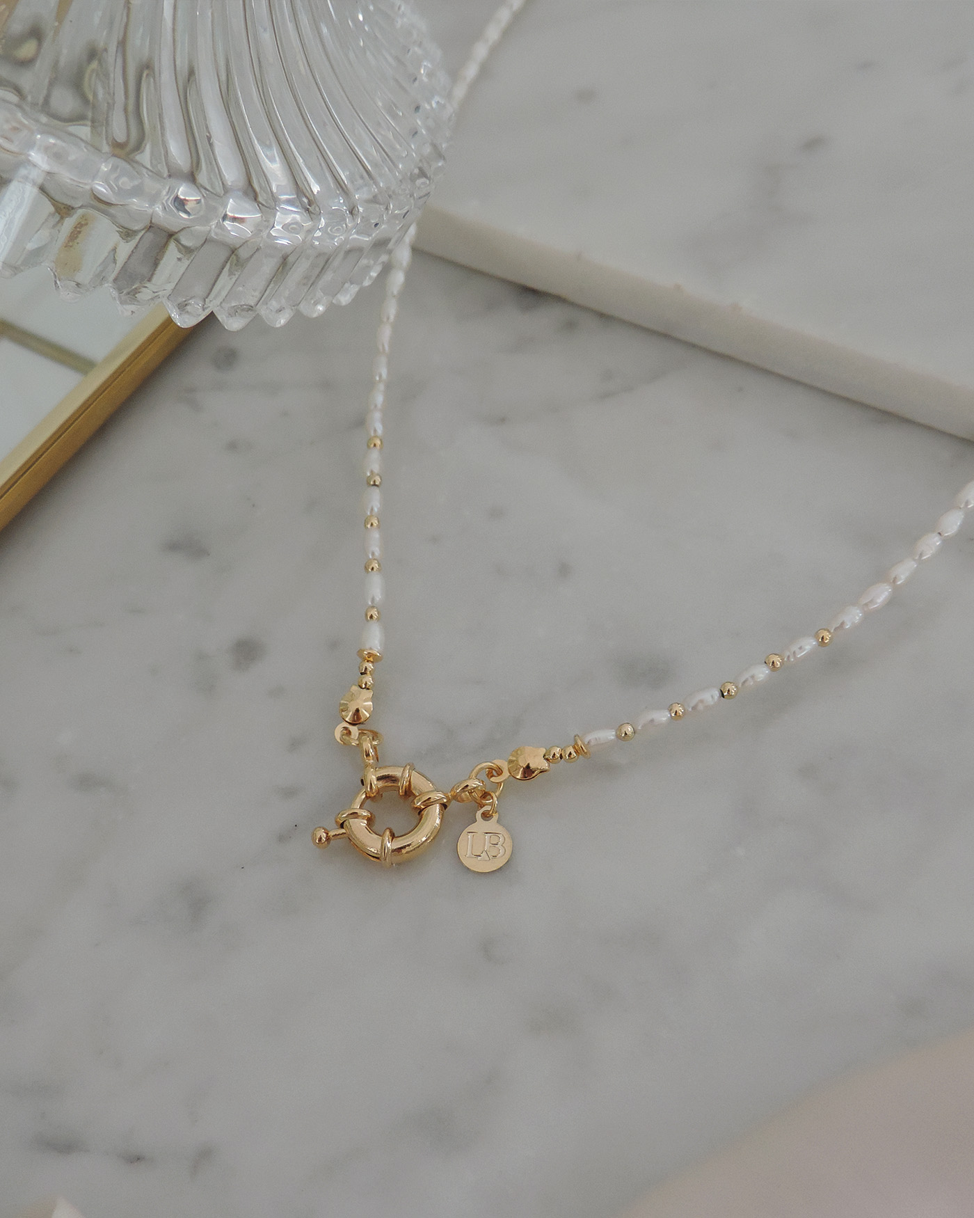 Collar tipo gargantilla en perlas de río naturales calidad premium arroz mini de 4mm aprox. realizado con tanza flexible + broche marinero de 11mm. Terminaciones en oro laminado hipoalergénico. (Las perlas pueden variar su brillo, forma ya que son perlas naturales).