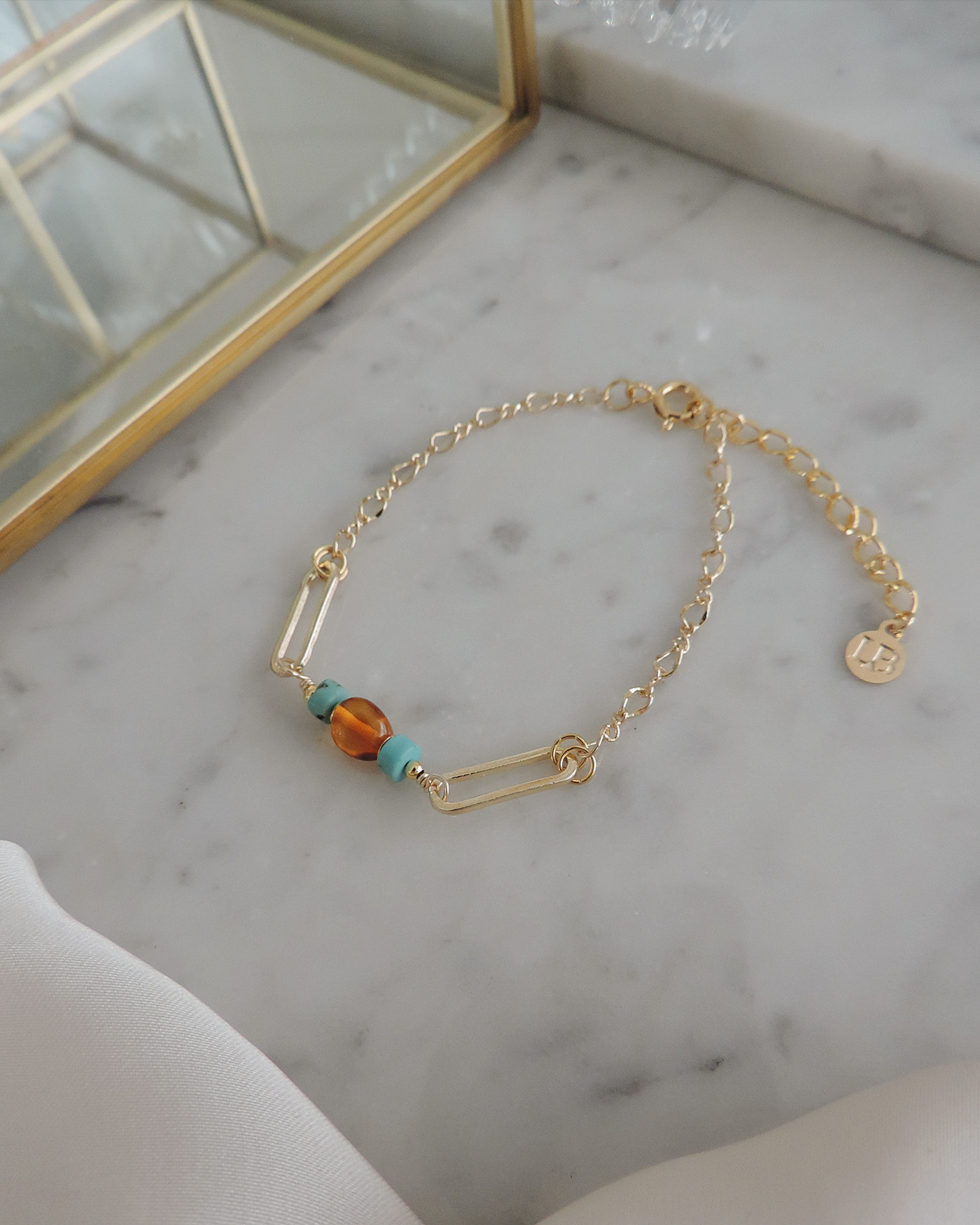 Pulsera realizada en oro laminado, cadena super delicada ochitos y eslabón rectangular de 14mm, con piedras naturales ambar y turquesa engarzadas con nudo de rosario a mano y cuentas laminadas en oro.