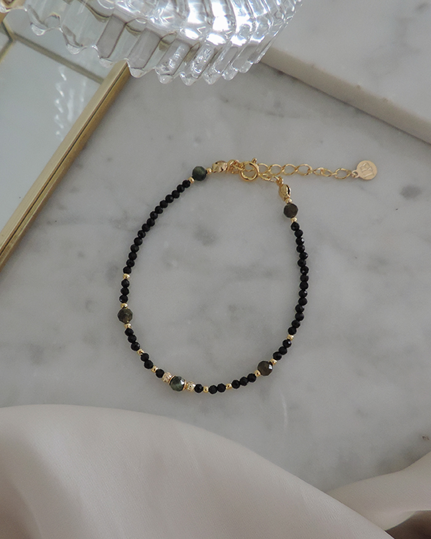 Pulsera realizada en oro laminado, con piedras naturales turmalinas negras mini y verdes + cuentas laminadas en oro.