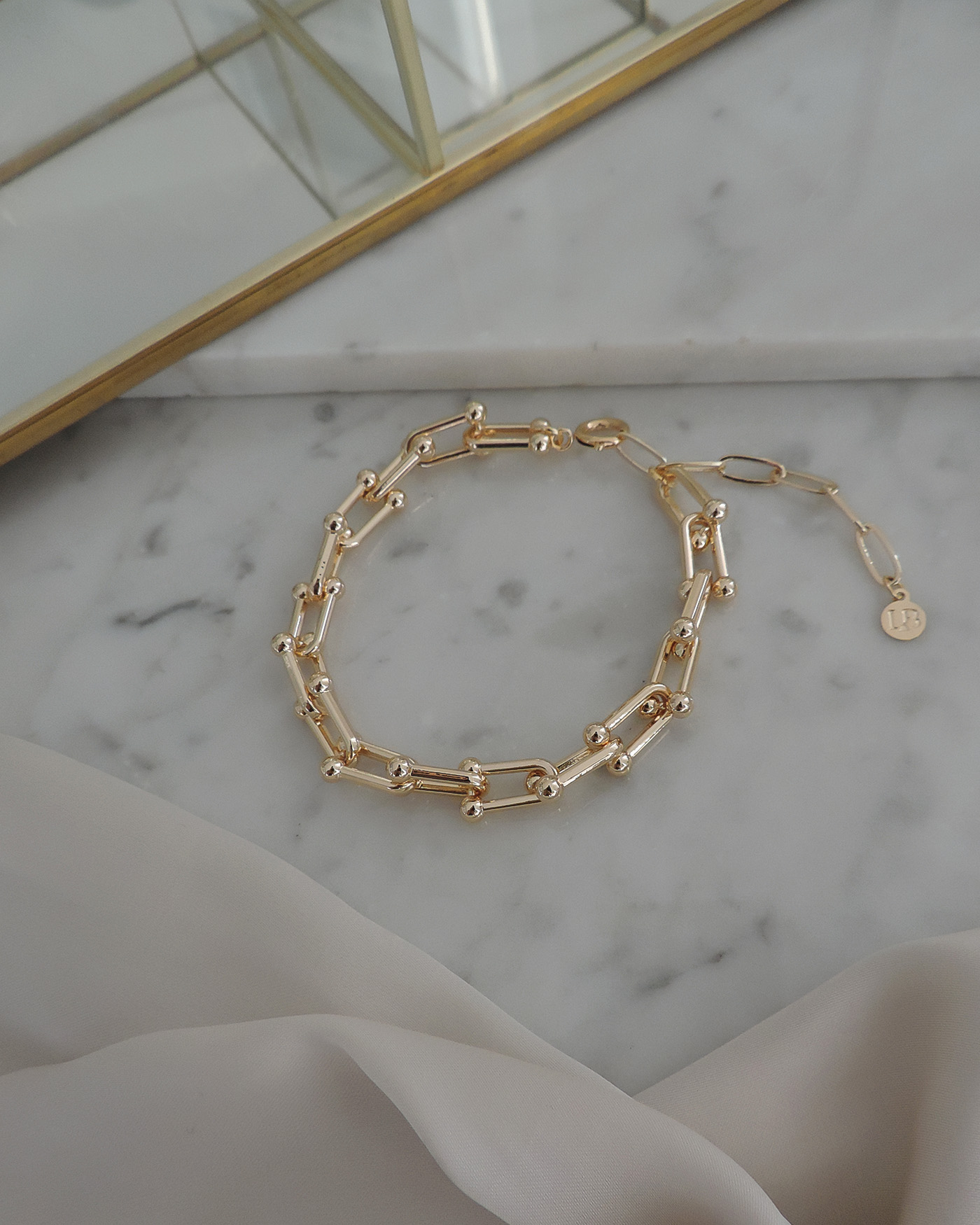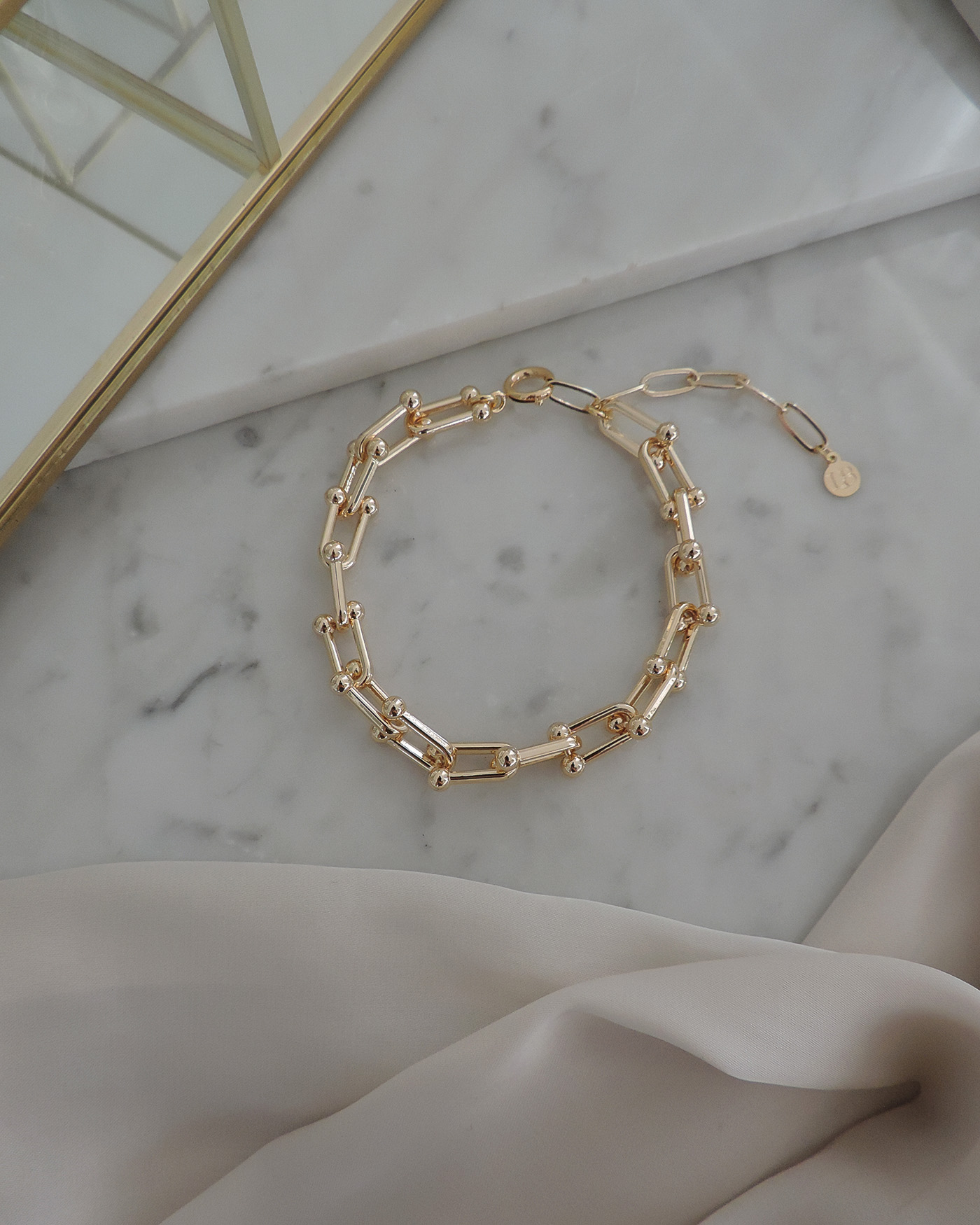 Pulsera realizada toda en cadena tipo Tiffany y terminaciones de oro laminado.