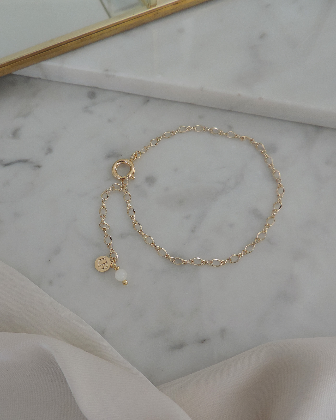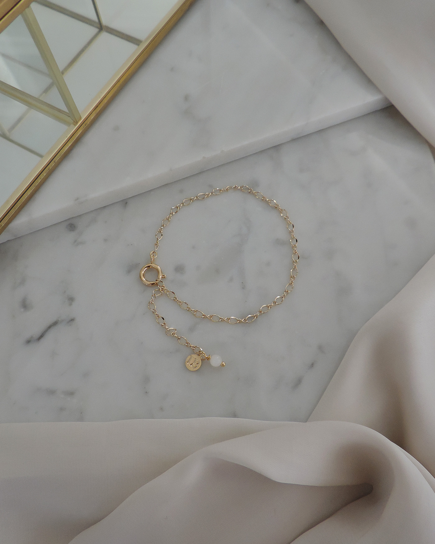 Pulsera realizada toda en cadena ochitos y terminaciones de oro laminado. Simple y delicada!